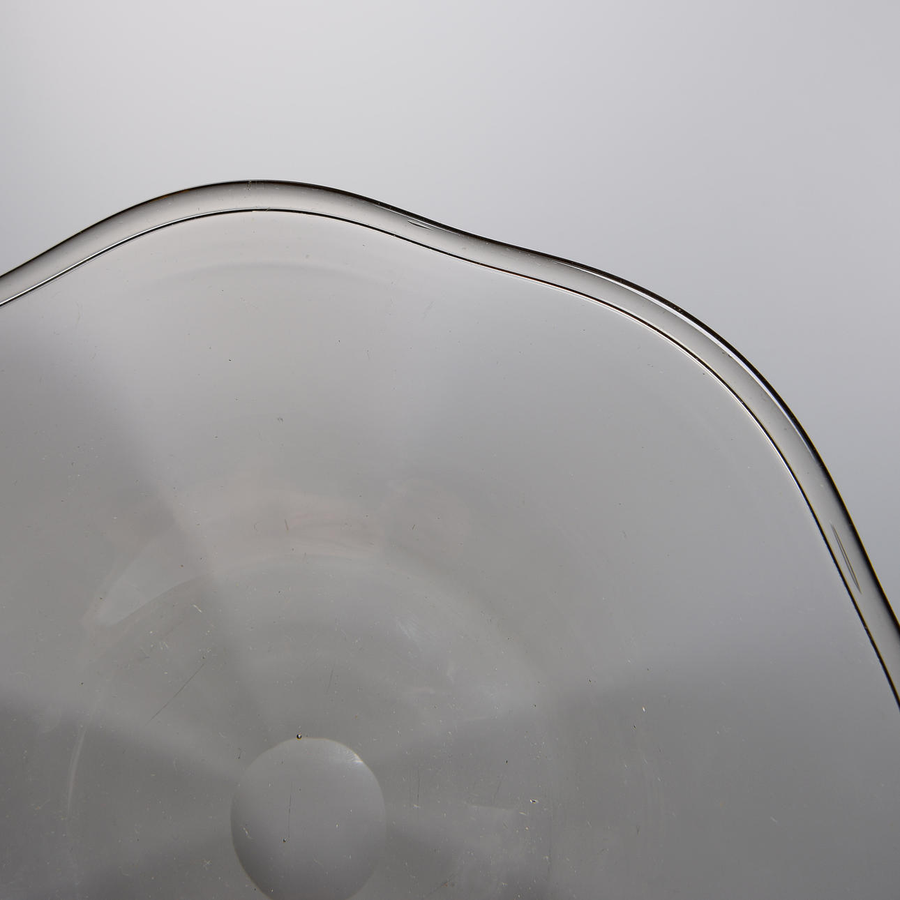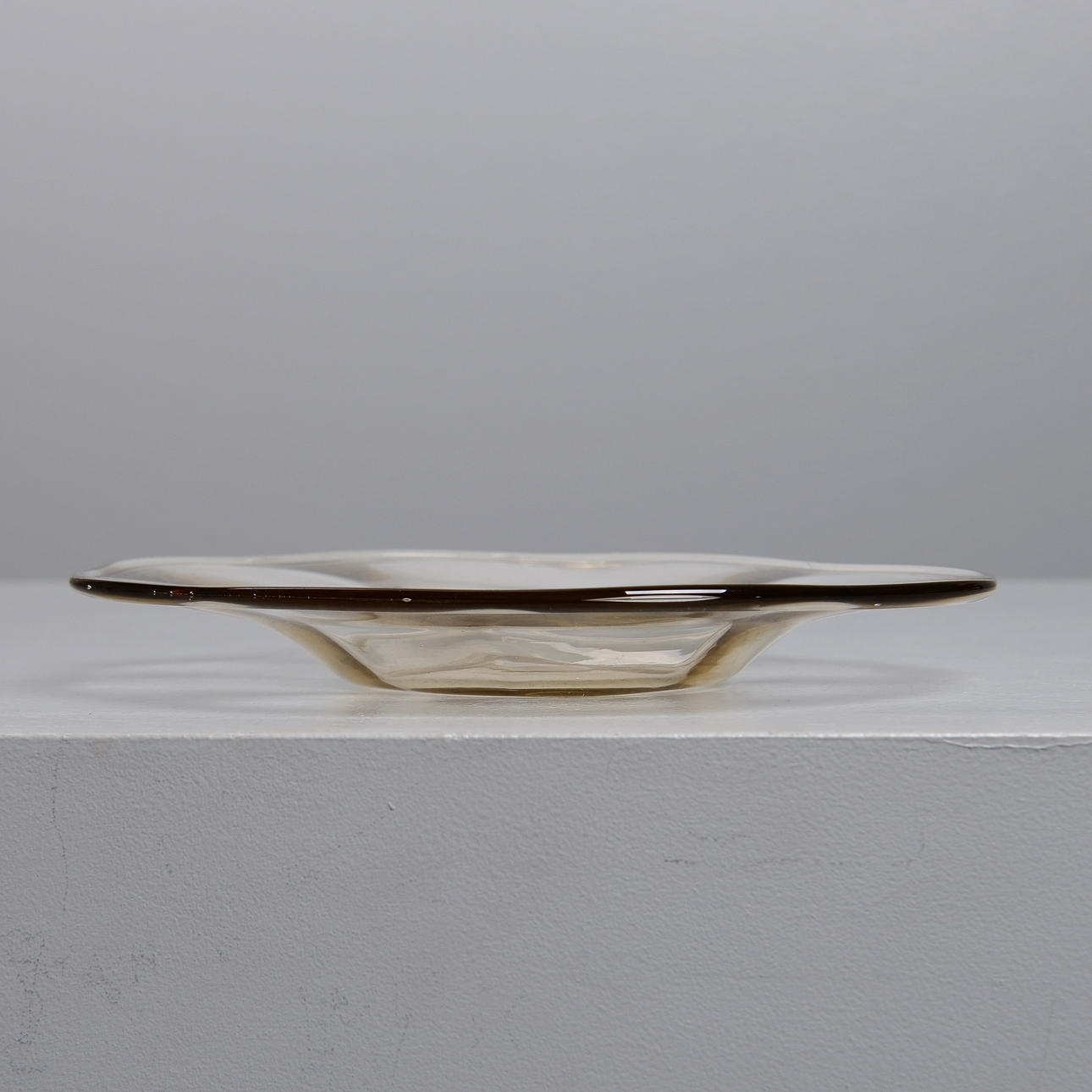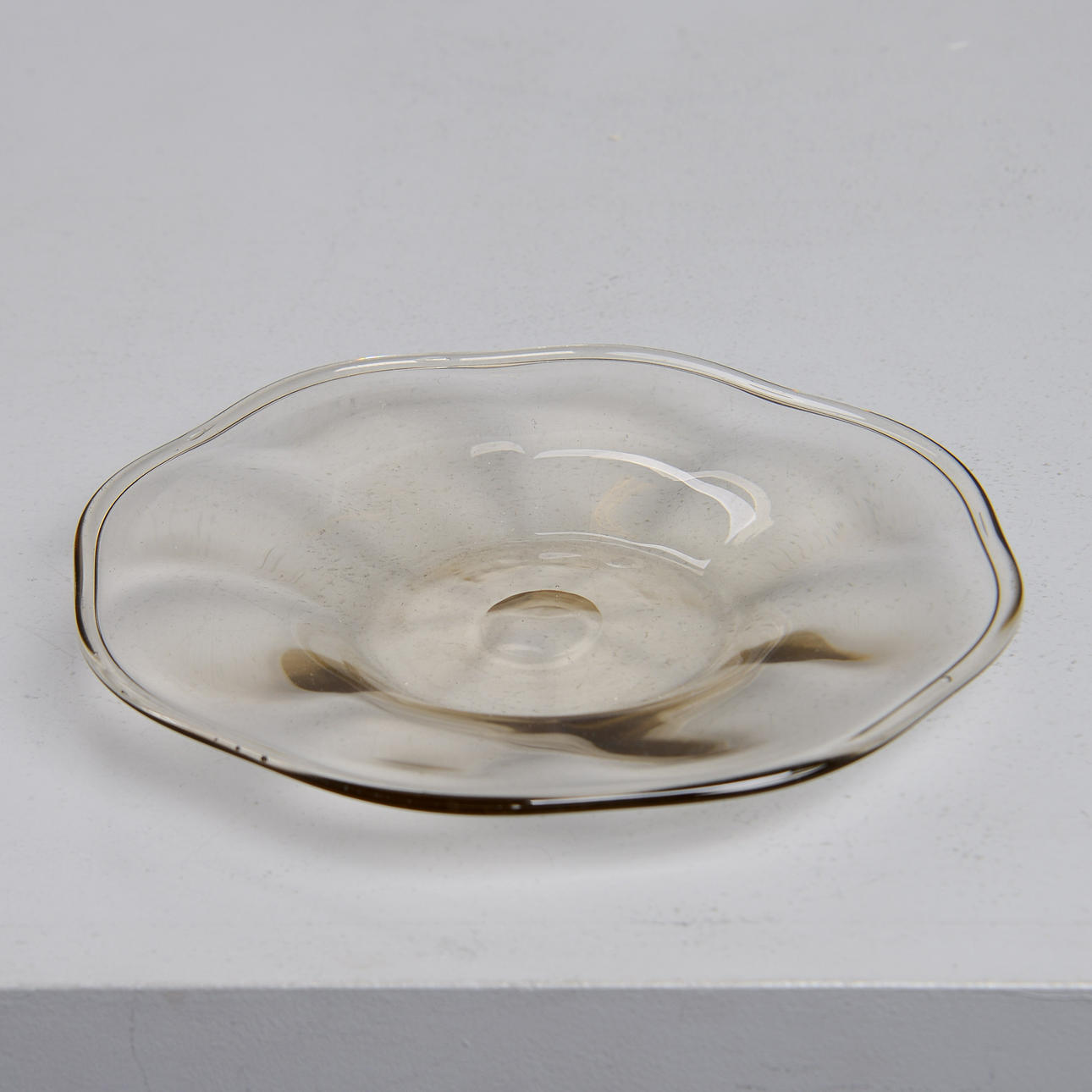 Smoky tinted glass with slightly wavy edge. Diameter 19 cm.