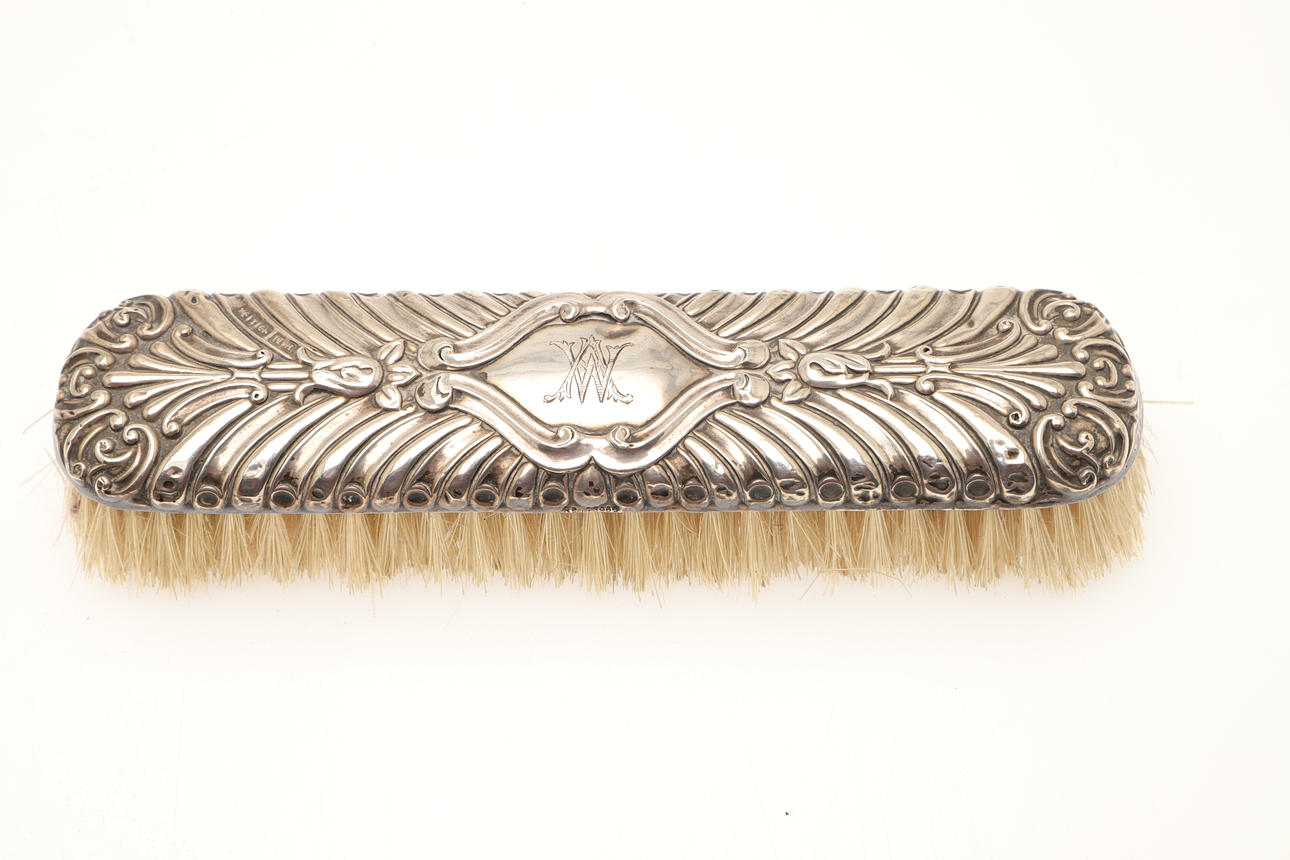 A Victorian silver backed clothes brush, by Henry Matthews, Birmingham 1883, 18cm wide.