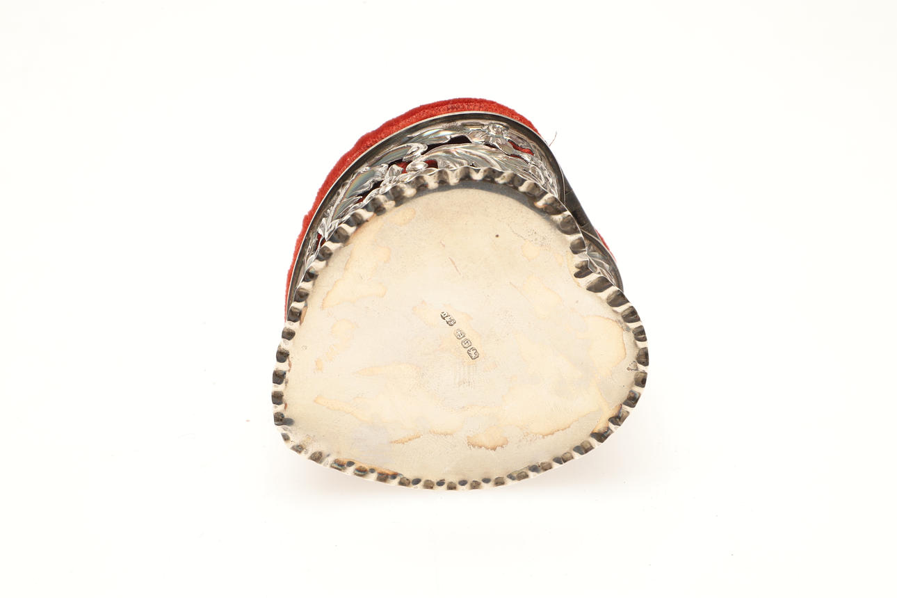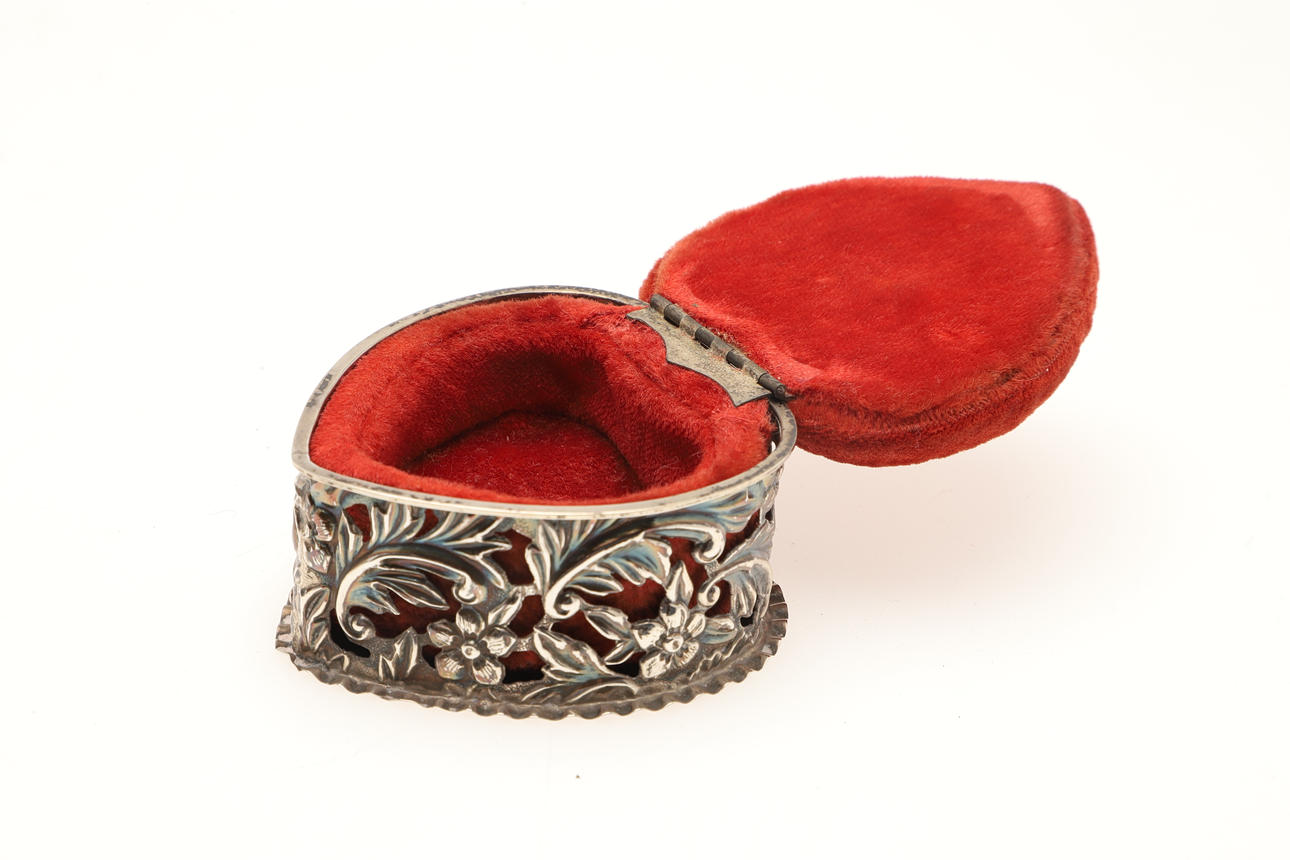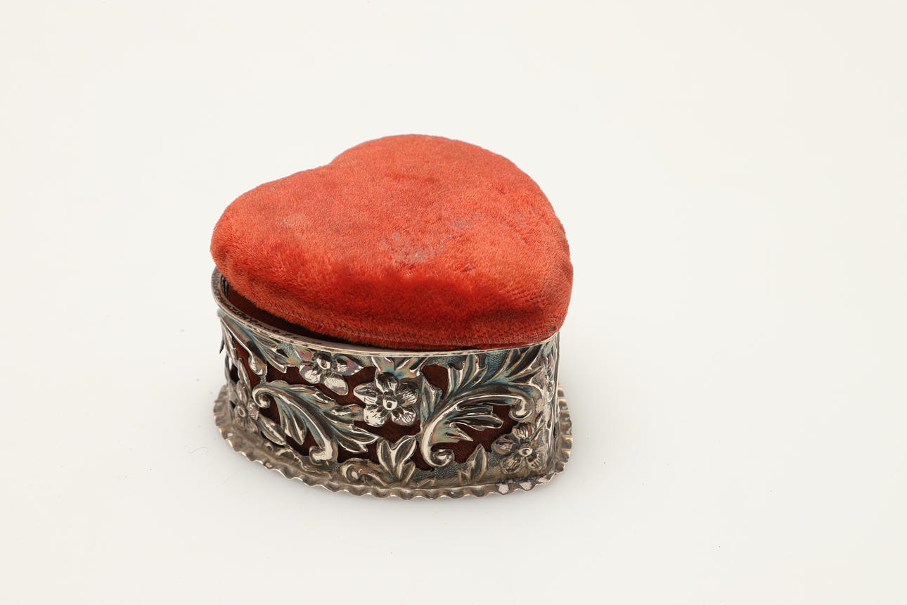 A Victorian silver heart shaped pin dish, baize lined lidded interior, Birmingham 1892.