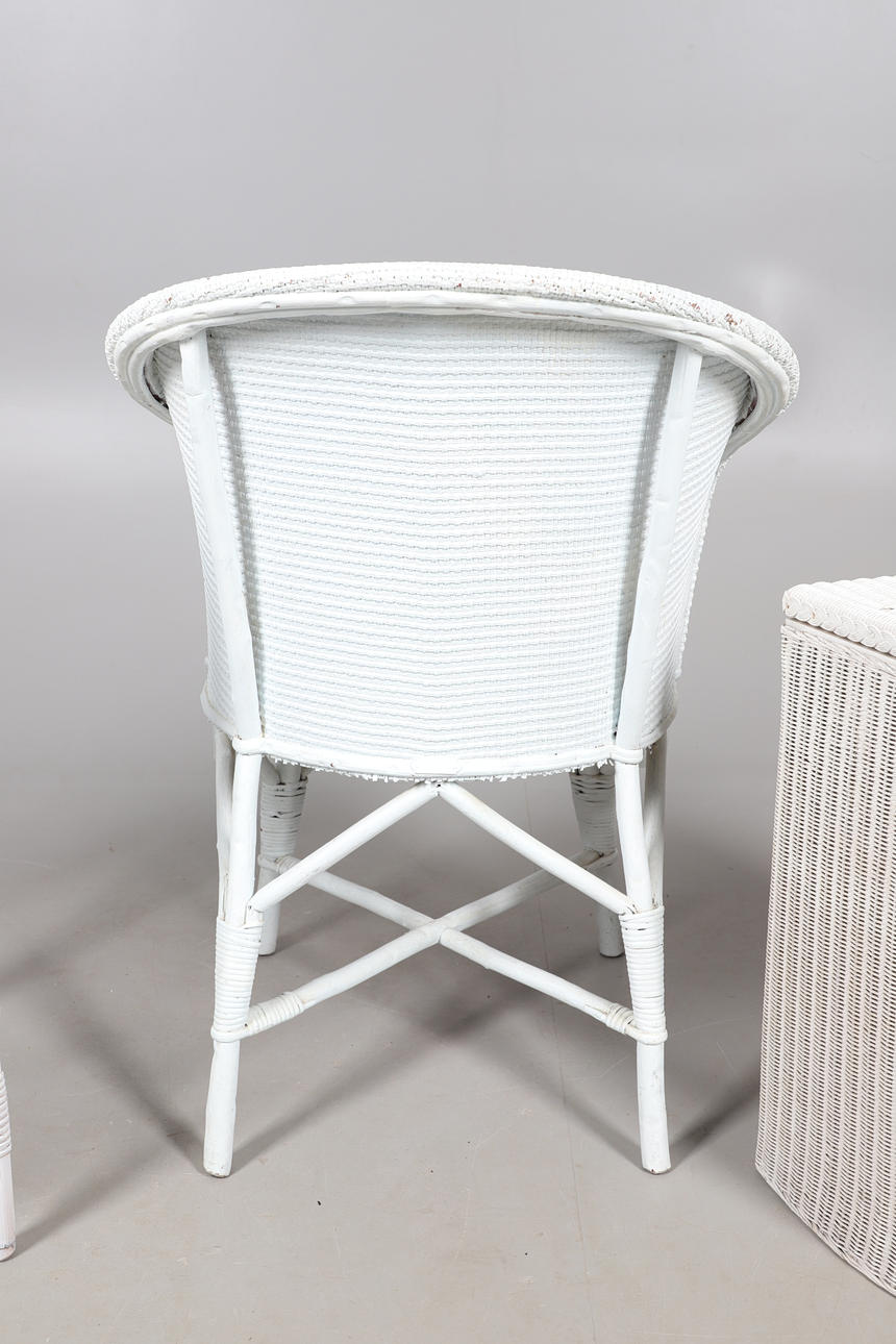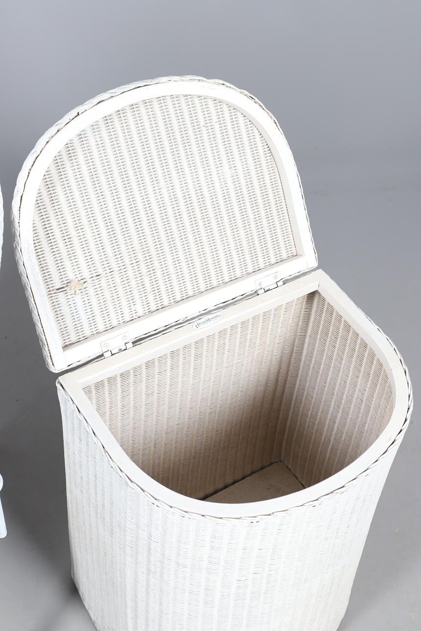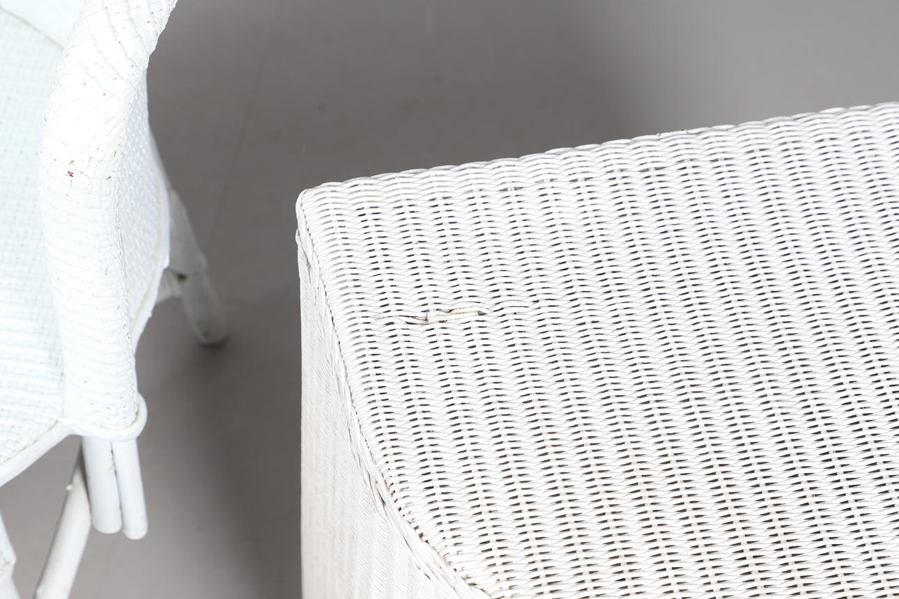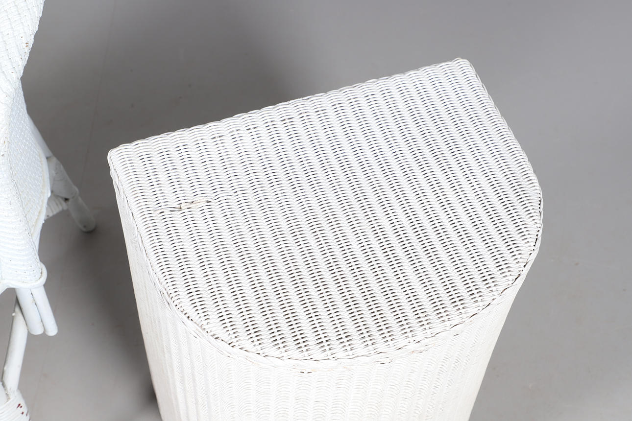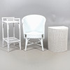 A Lloyd Loom linen basket, labelled io interior, 50cm high x 40cm wide, together with a rattan white painted chair, and a rattan two tier occasional table, 76cm high x 55cm wide.