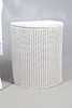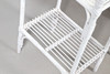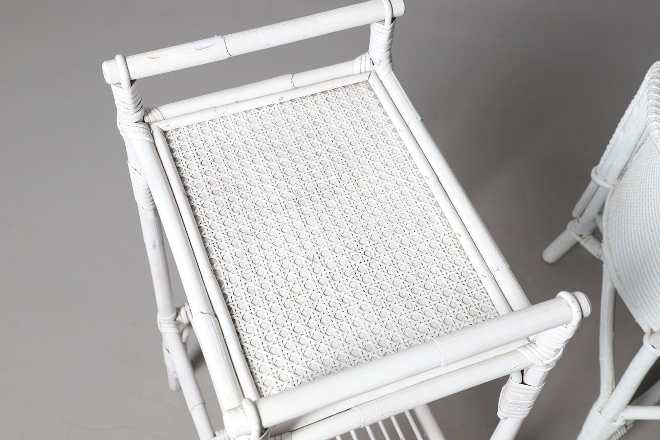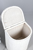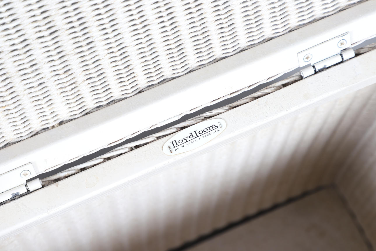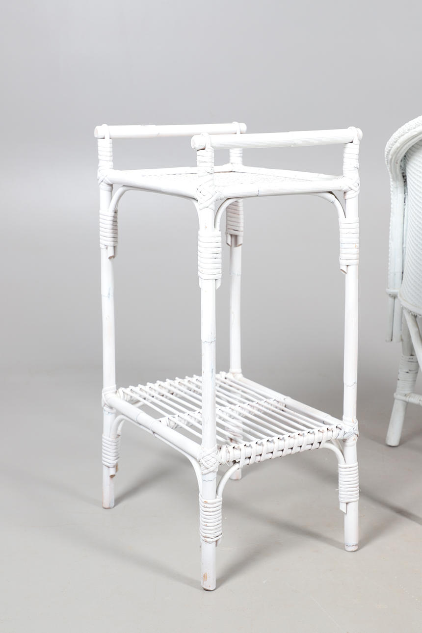A Lloyd Loom linen basket, labelled io interior, 50cm high x 40cm wide, together with a rattan white painted chair, and a rattan two tier occasional table, 76cm high x 55cm wide.