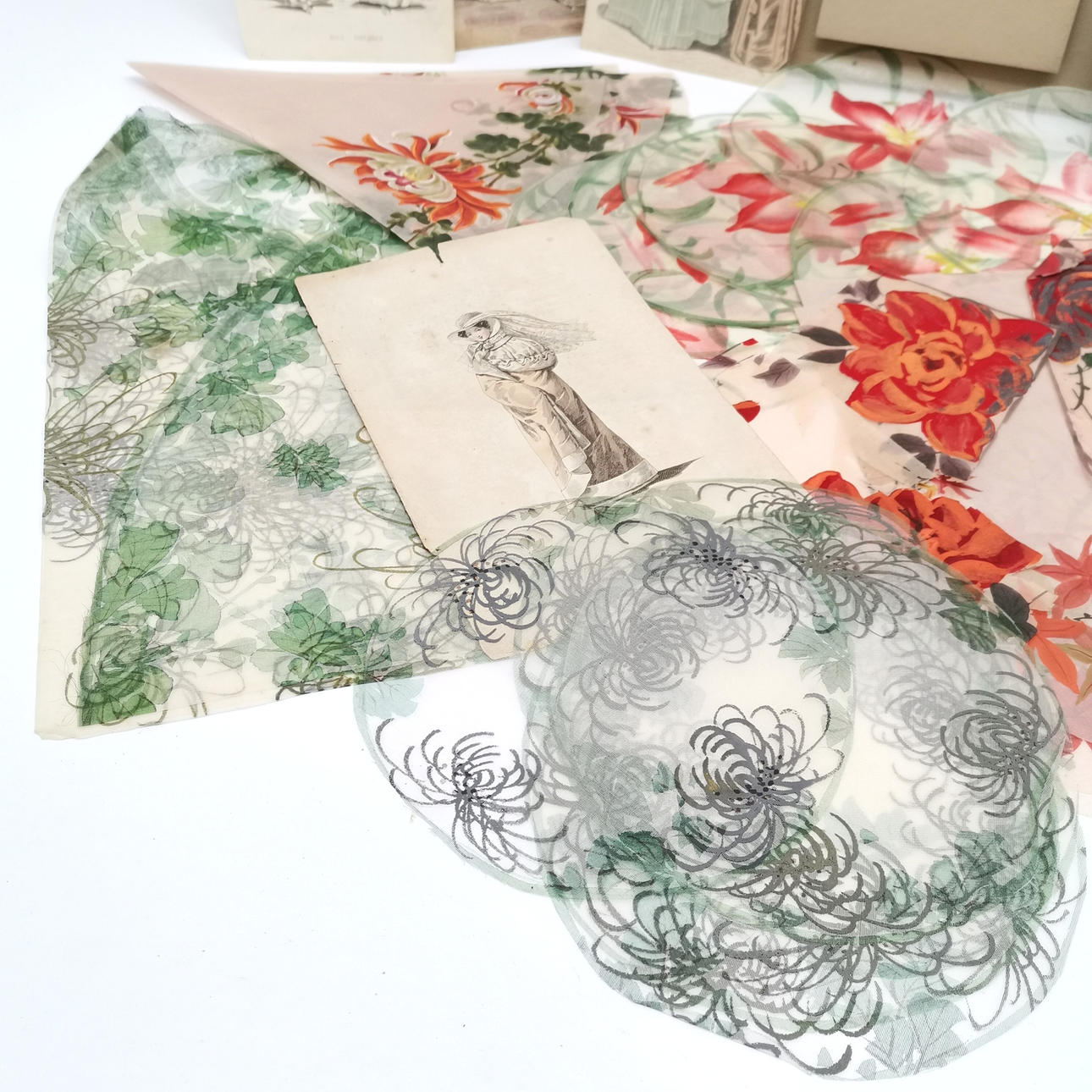 3 x hand painted textile samples t/w fashion prints & 2 x Fairy Dyes calendars (1938 & 39) - largest calendar 46cm x 29cm.