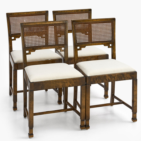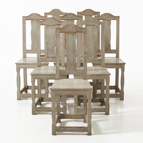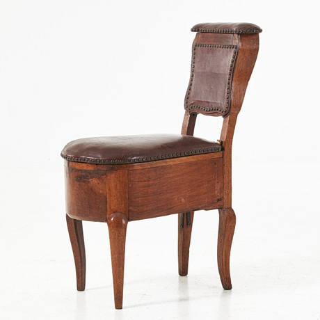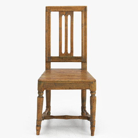Later painted, reupholstered and replaced seat, renovated and supplemented, wear and tear, scratches, marks, damage, wood cracks.