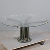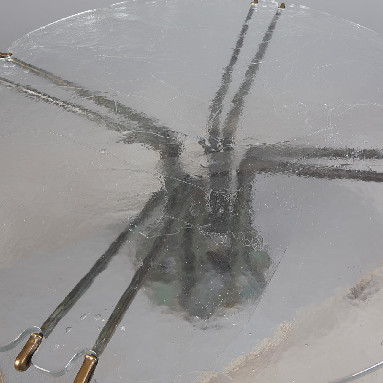 Lothar Klute (1946 - 2023), Brutalist table, bronze, partially patinated green, glass, transparent, signed in the glass and monogrammed in the foot and dated 96.