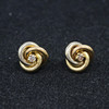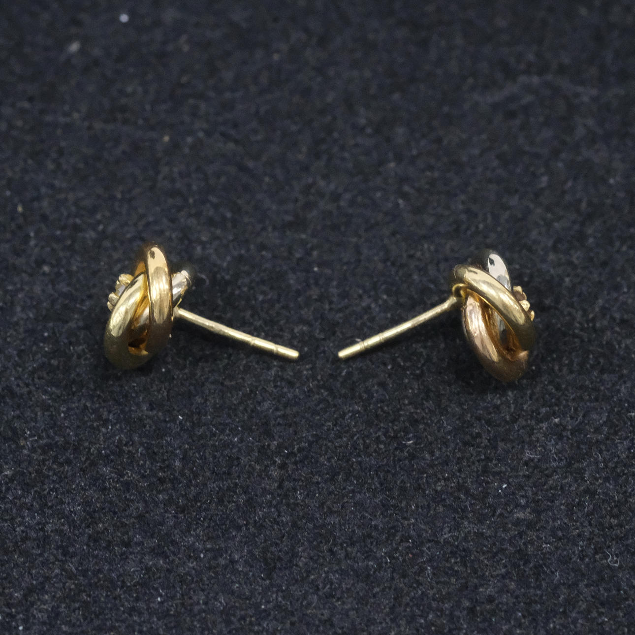 In the form of knots, 18k gold in three colors, each with a white stone, with pins, back pieces missing, diameter approx. 10 mm, weight 3,1 grams.
