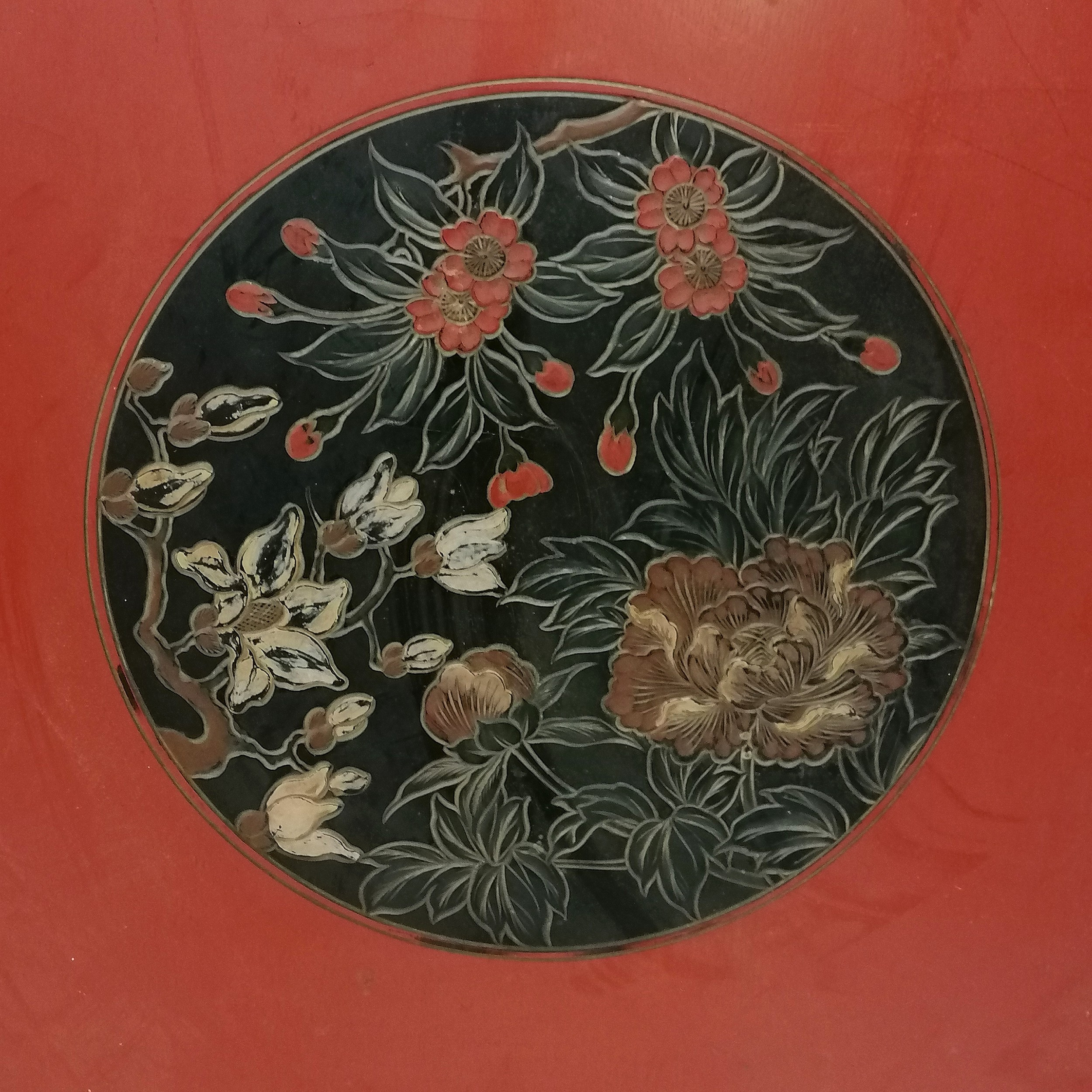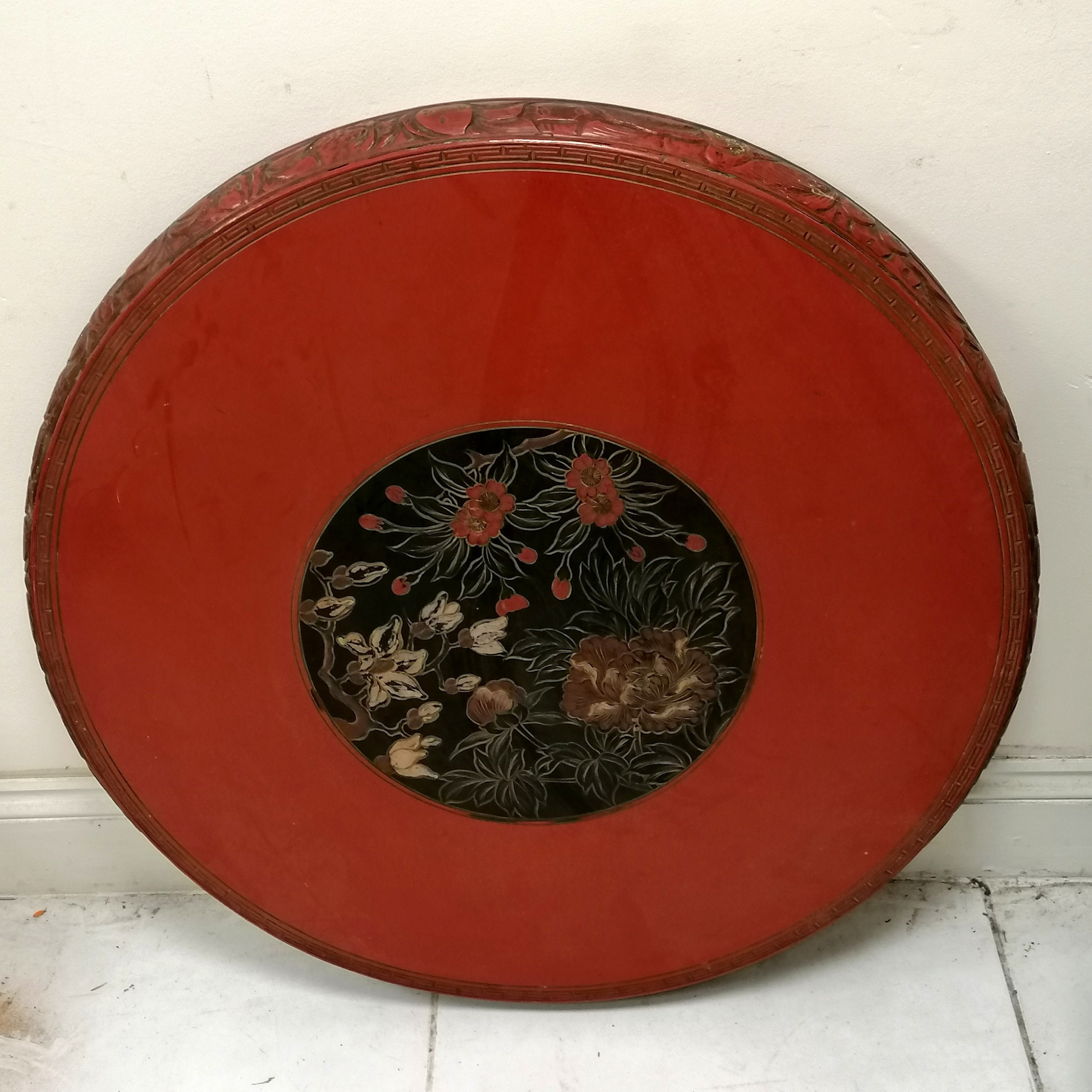 4345875. ORIENTAL RED LACQUER CIRCULAR TABLE TOP.