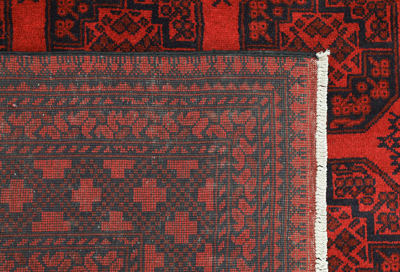 Main field with red base color as well as afghanistan octagons. Main border with geometric pattern.