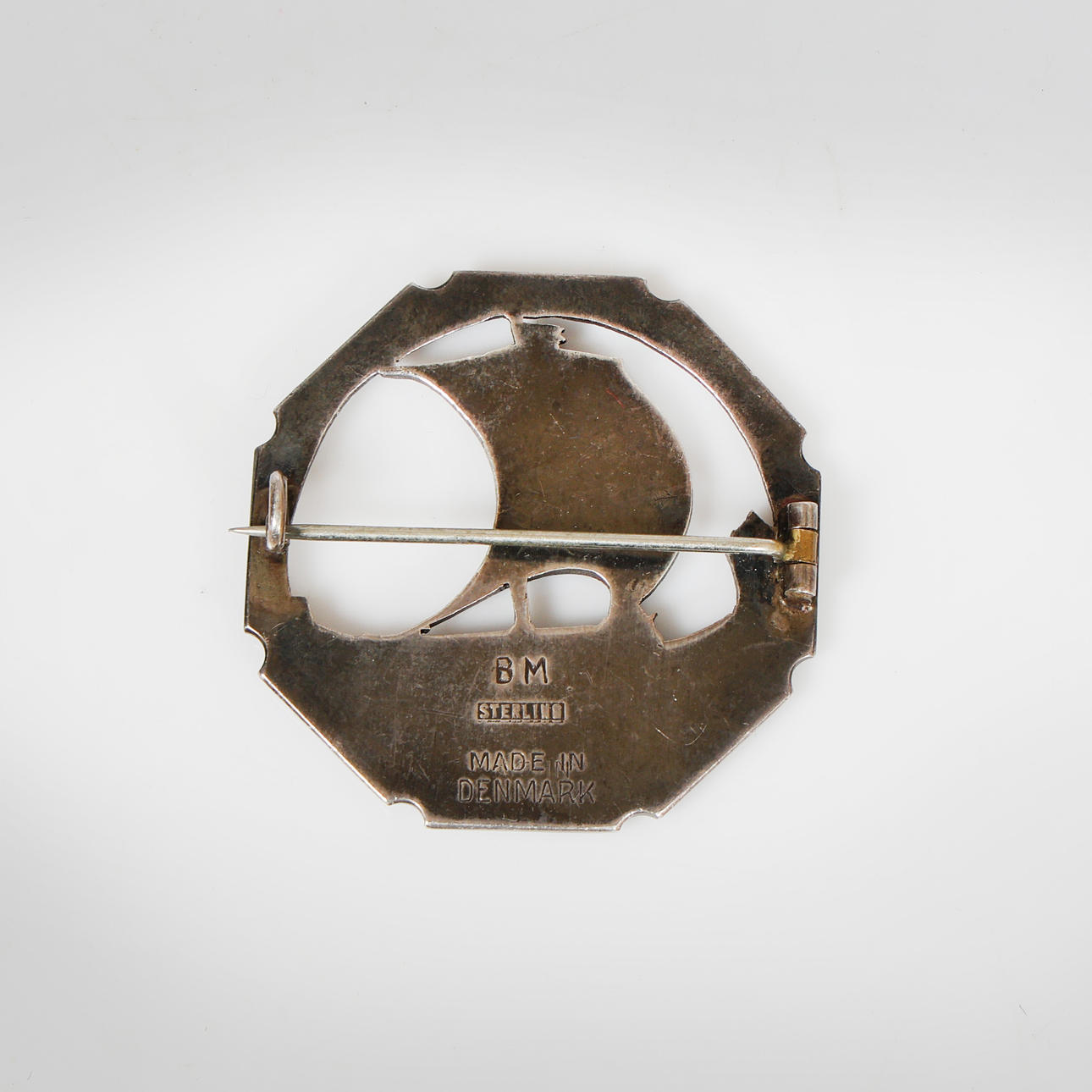 Depicting a Viking longship, marked "BM" to the reverse, 3.5cm wide.