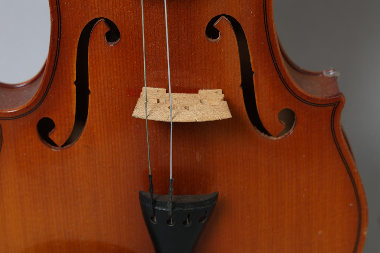 The 3/4 violin labelled 'Suzuki No. 220 Size 3/4 Anno 1980 Suzuki Violin Co., Ltd.', back length 33.5cm, total length 55.5cm.