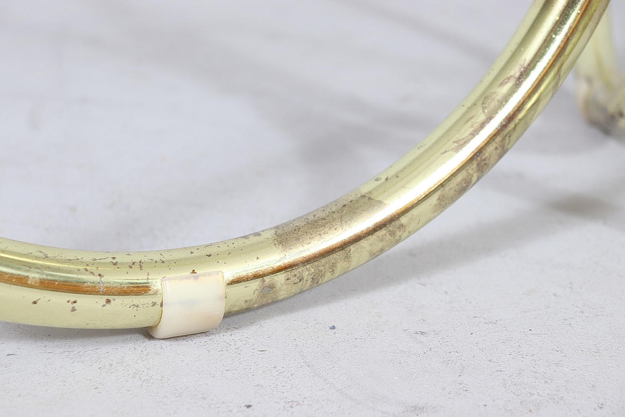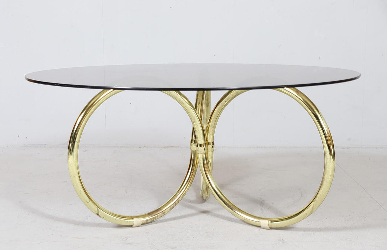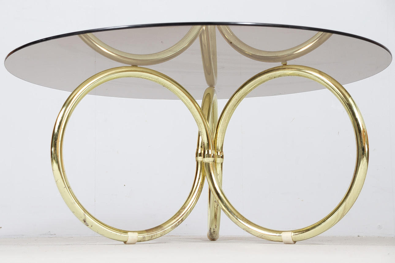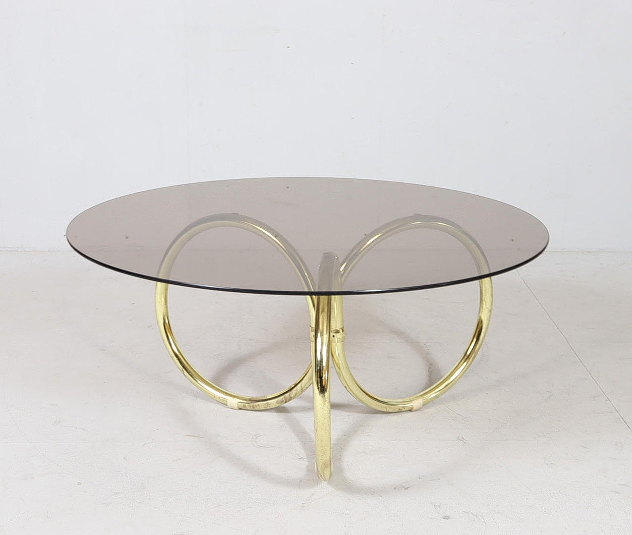 Mid century coffee table/coffee table, Italy, 1970s, solid construction made of metal in golden color, with a round glass top (loose),