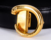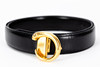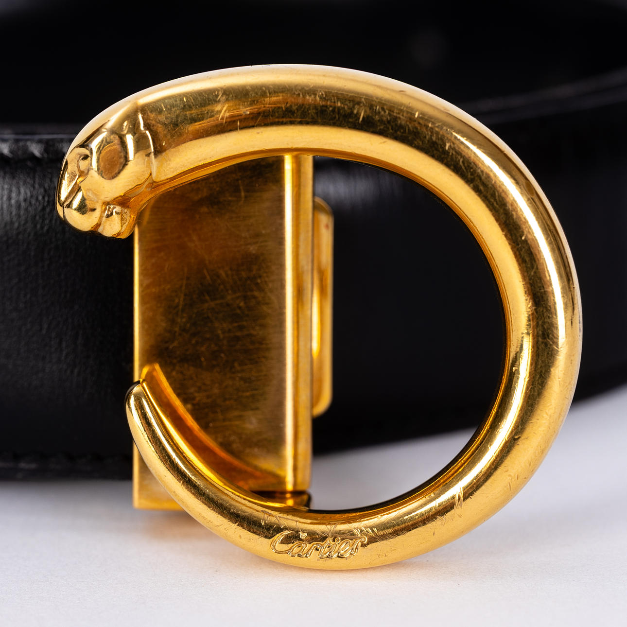 Panthère de Cartier belt, black leather and interchangeable gold-finish buckle, “Cartier” embossing.