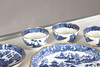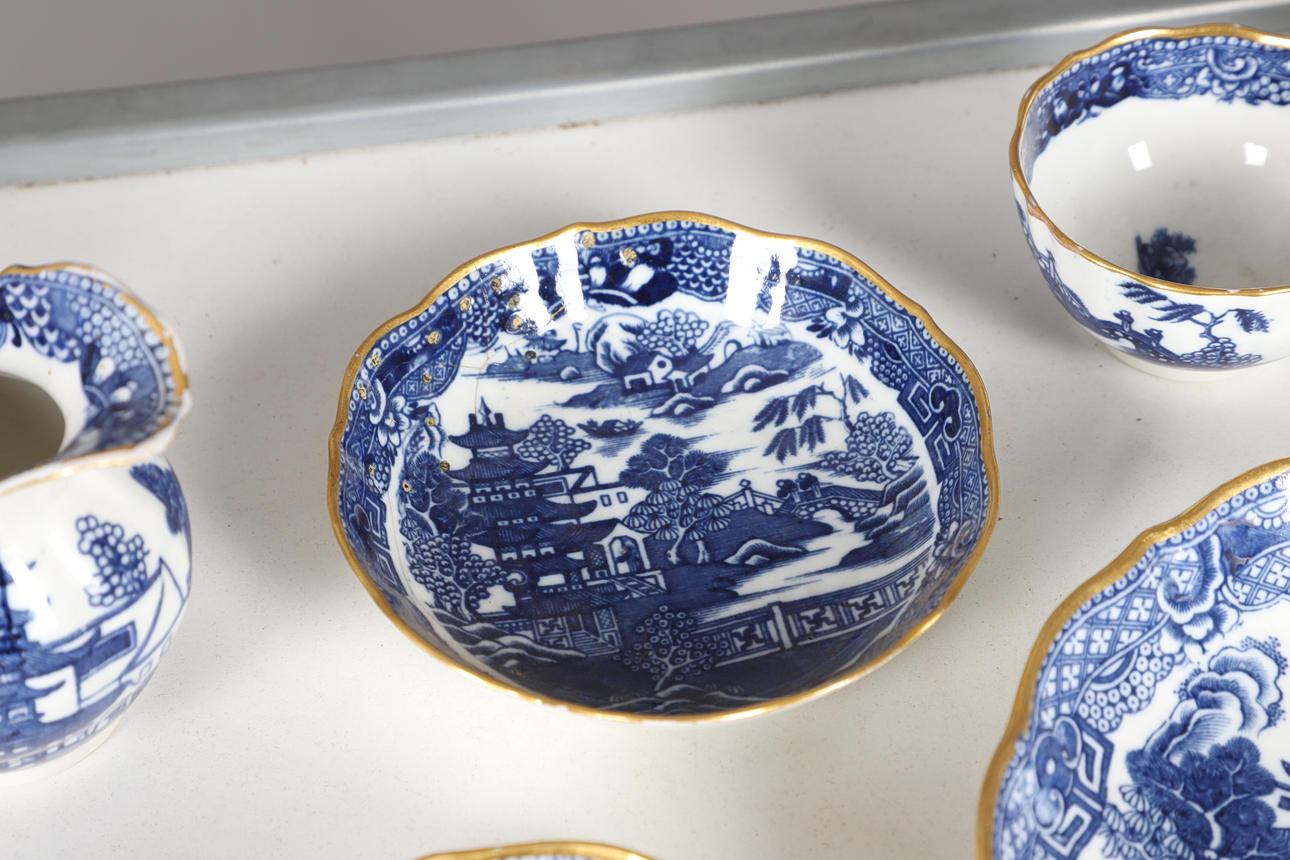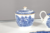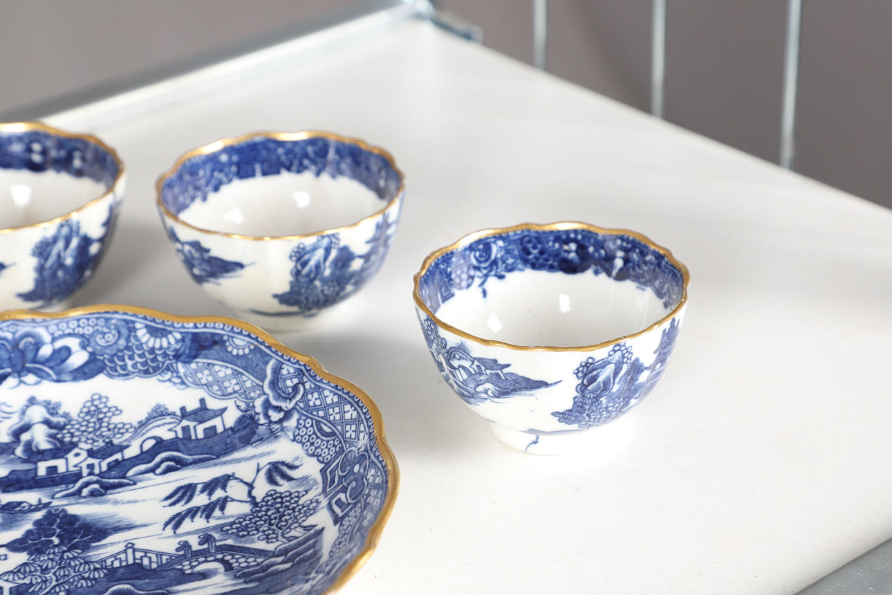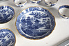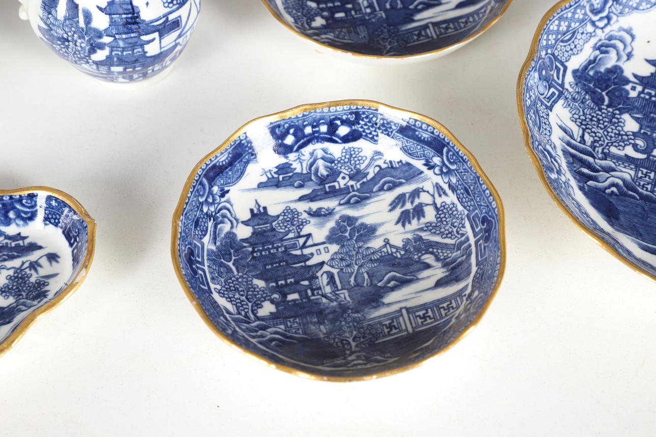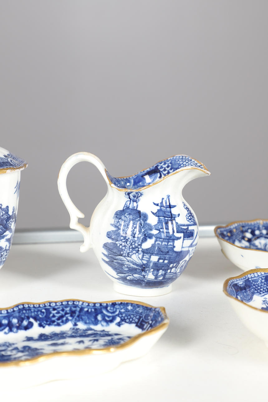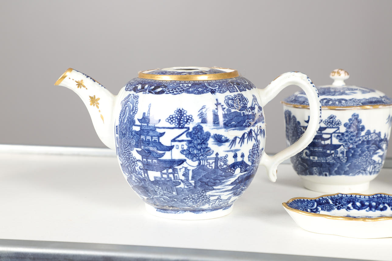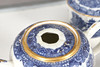 to include a teapot and cover, a milk jug, a sucrier and cover, four tea bowls, two saucers, a saucer dish, and a spoonr rest, each painted in underglaze blue, gilt line borders, most with printed S mark, the teapot 12cm high (11).