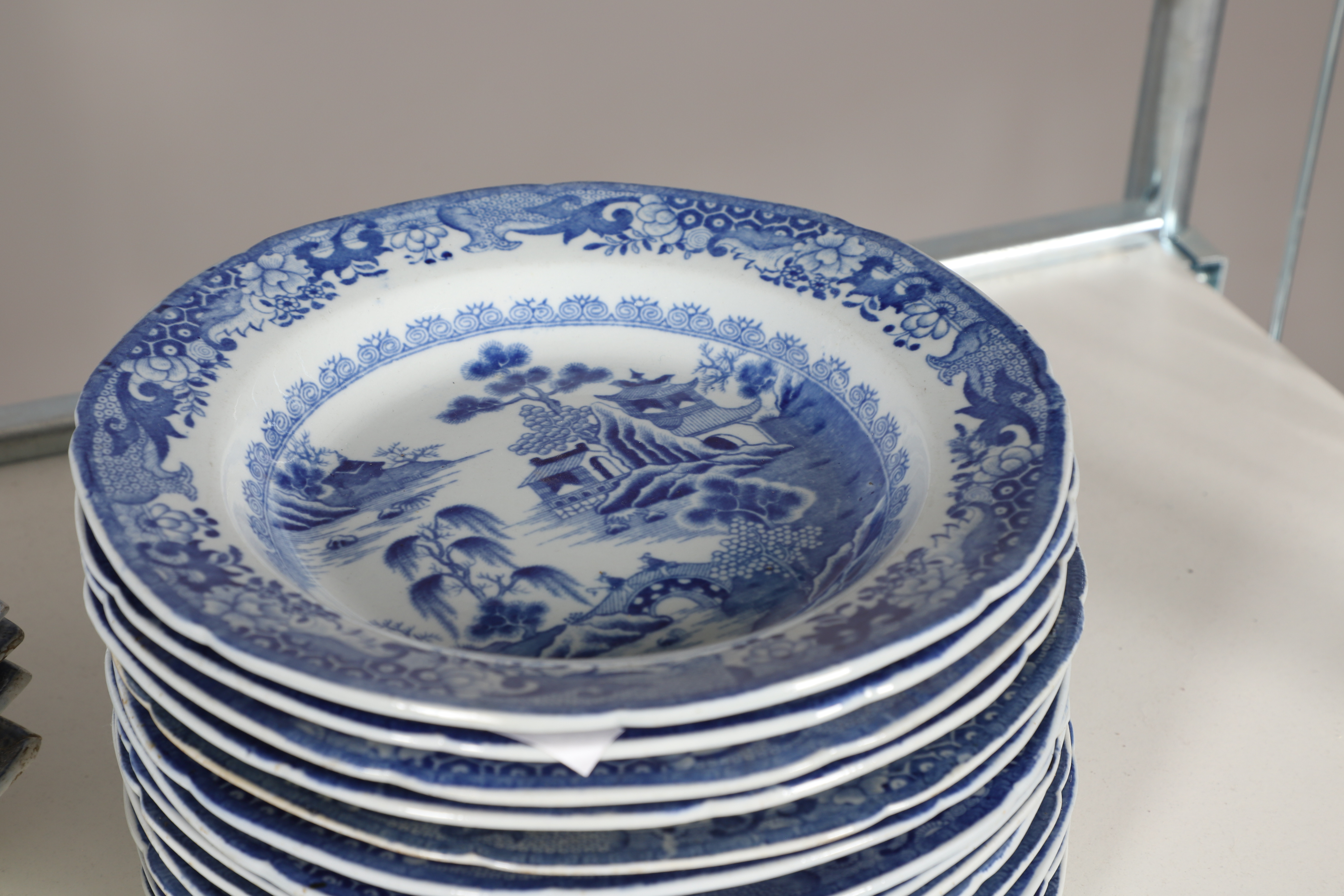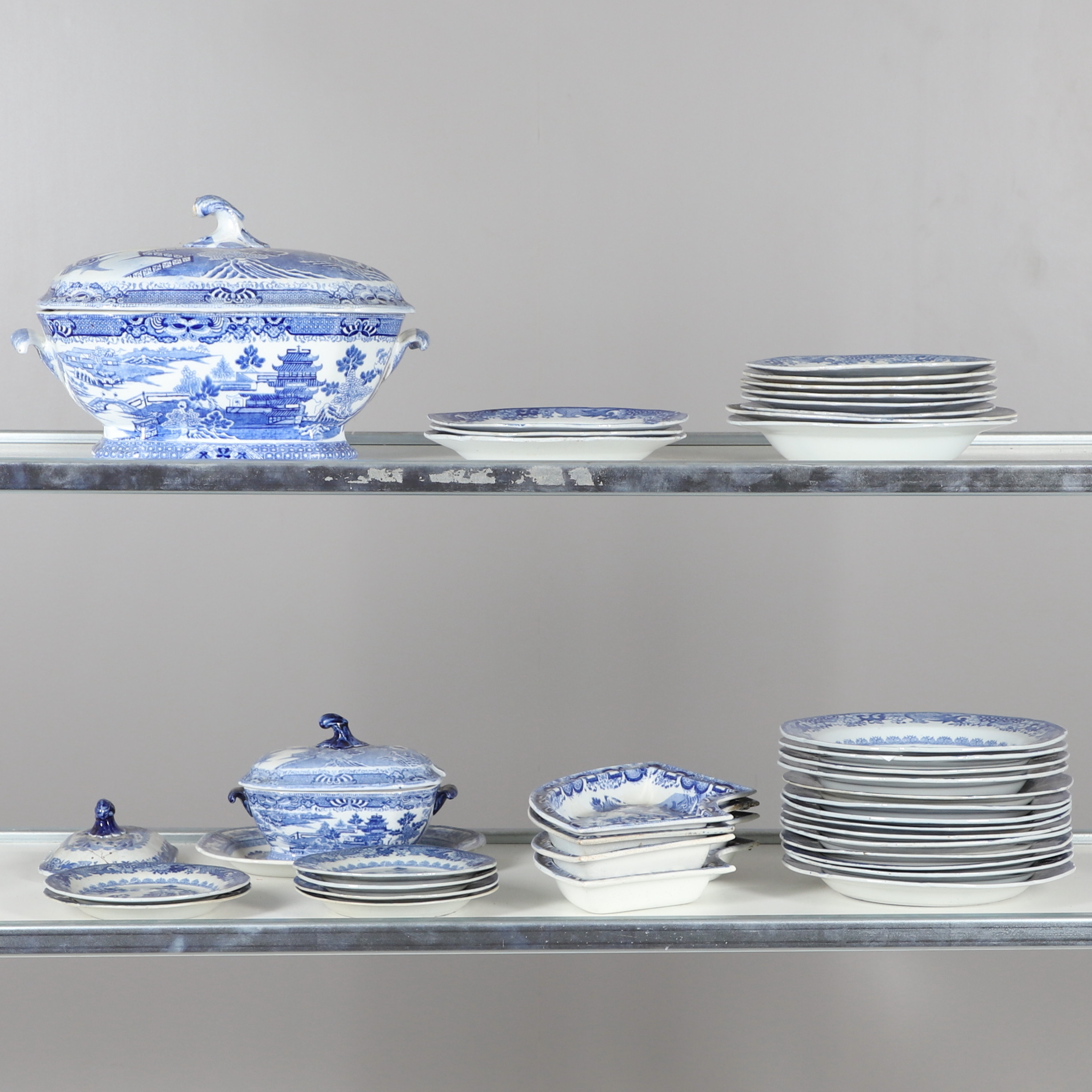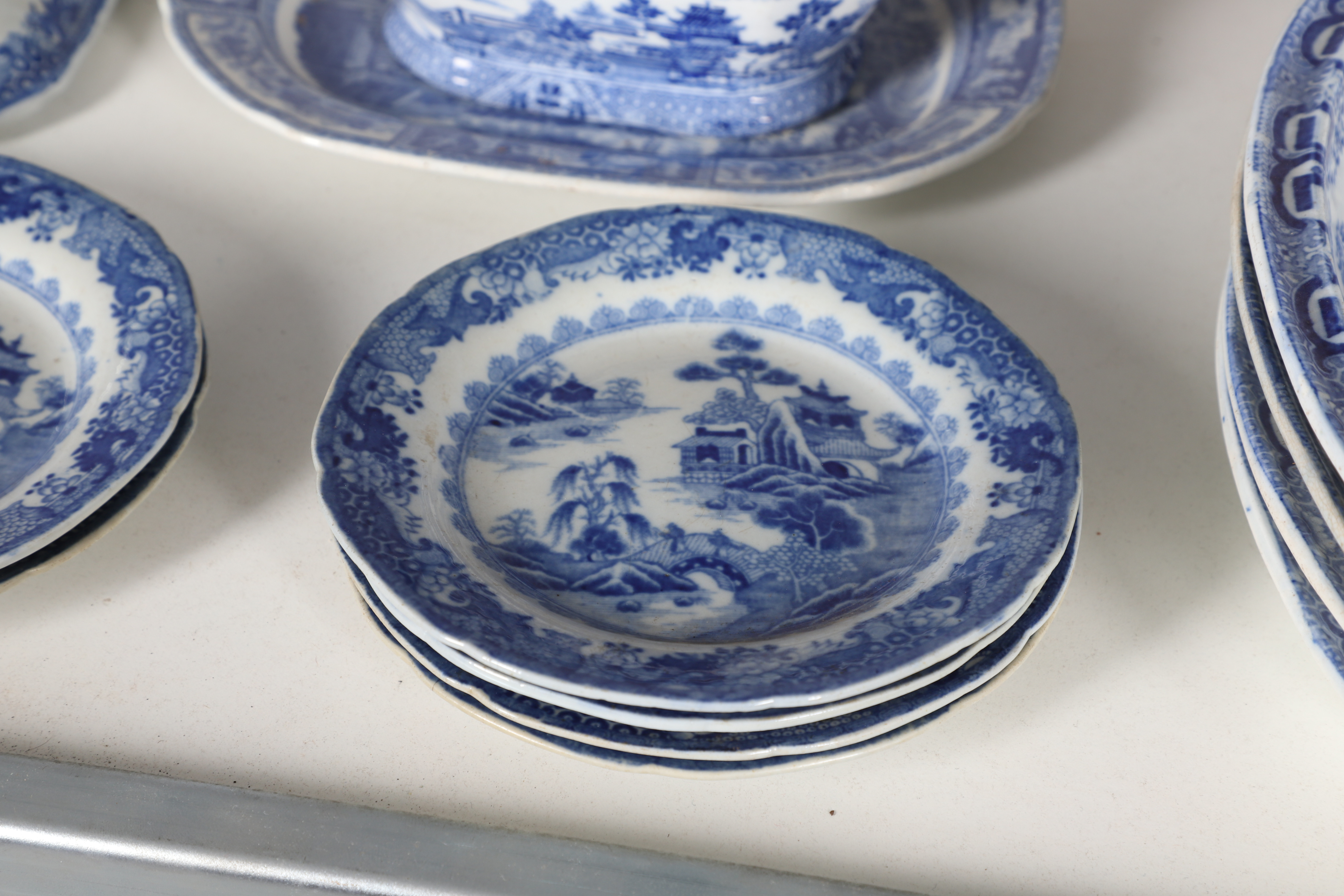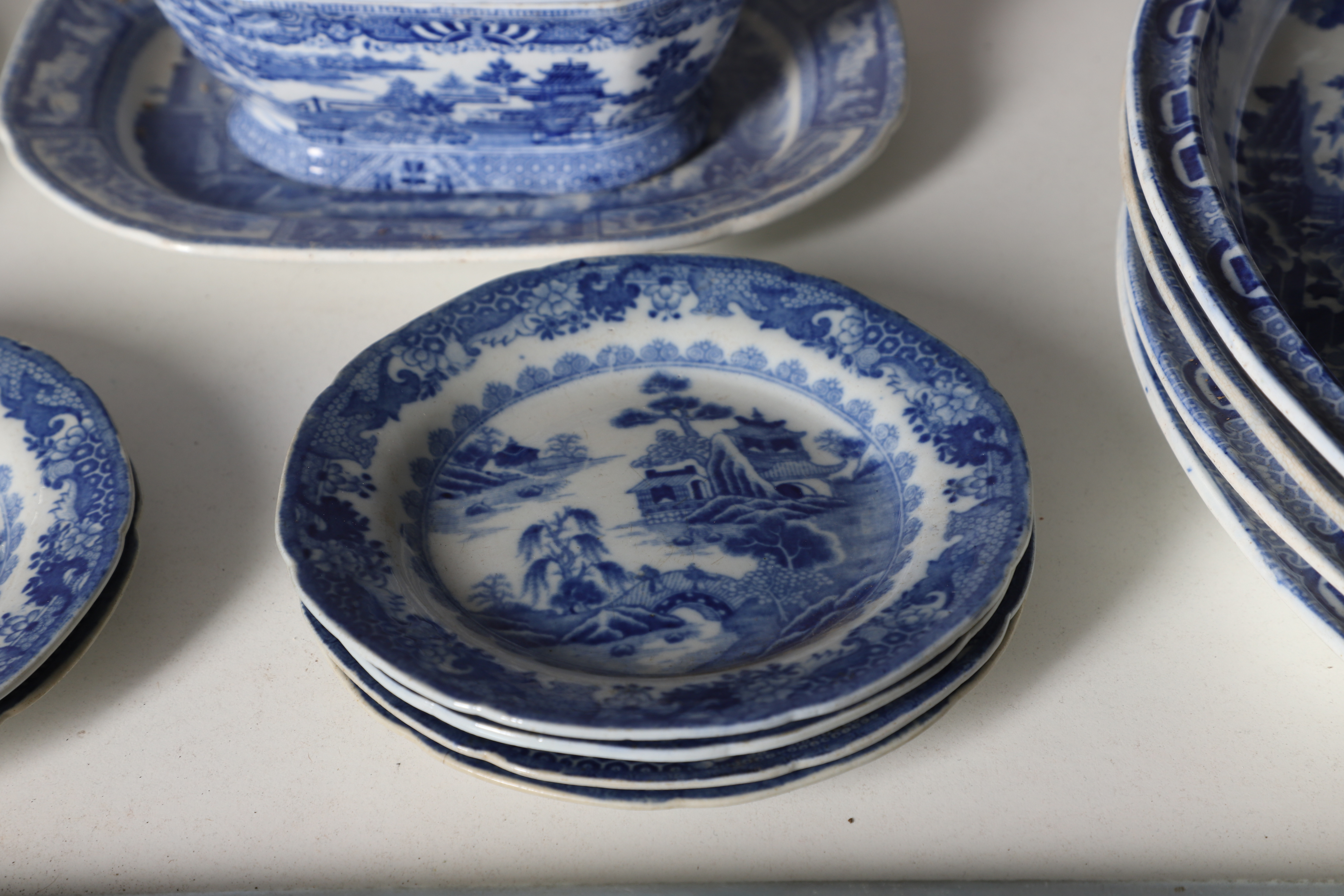 4347036. AN EARLY NINETEENTH CENTURY EARTHENWARE WILLOW PATTERN PART DINNER SERVICE.