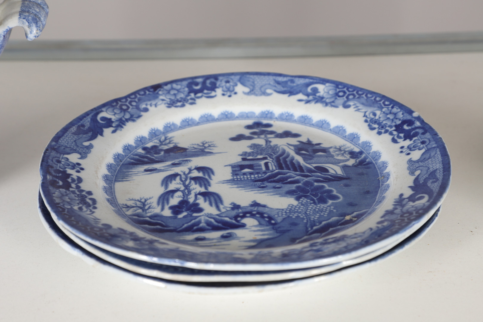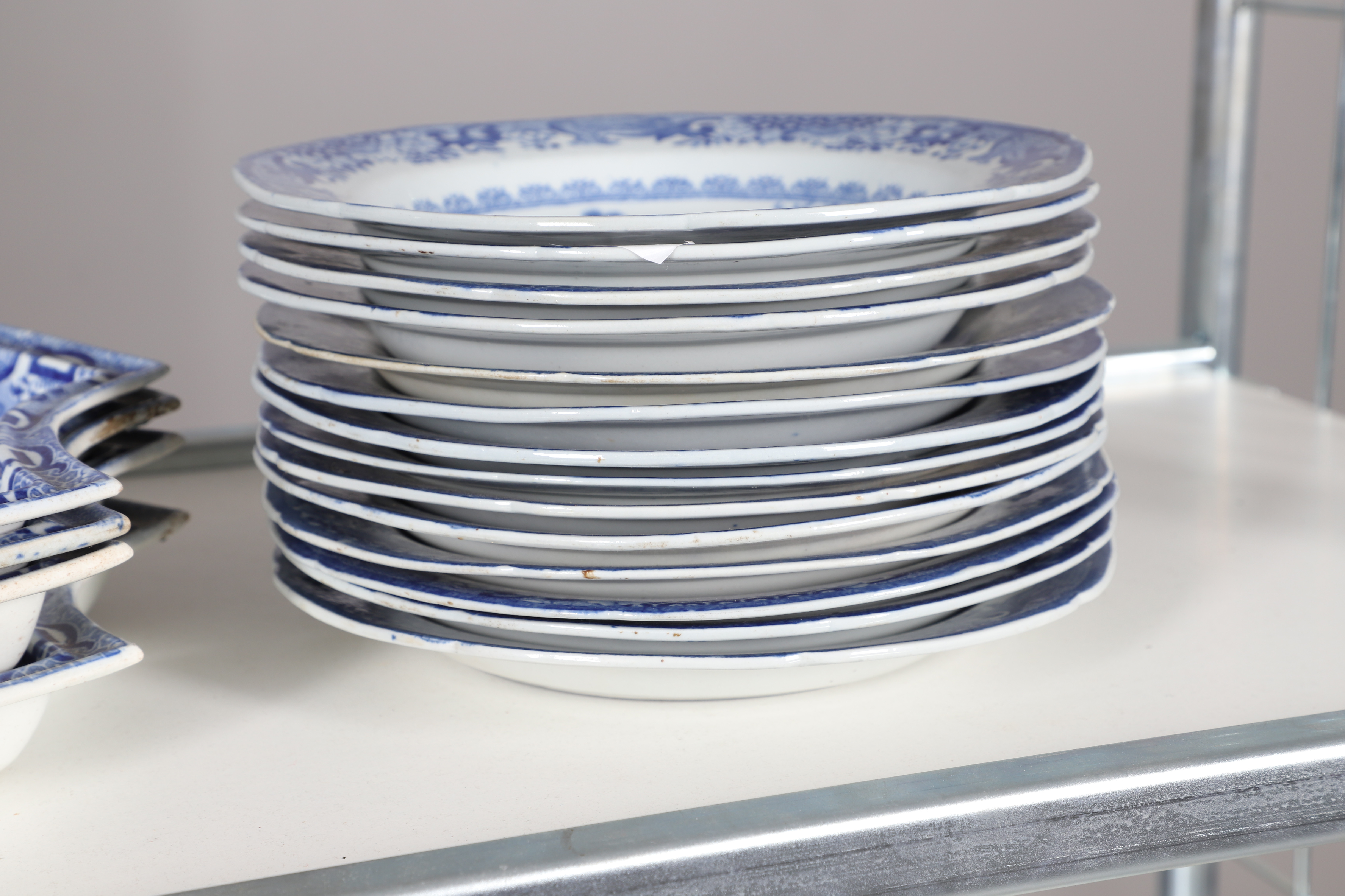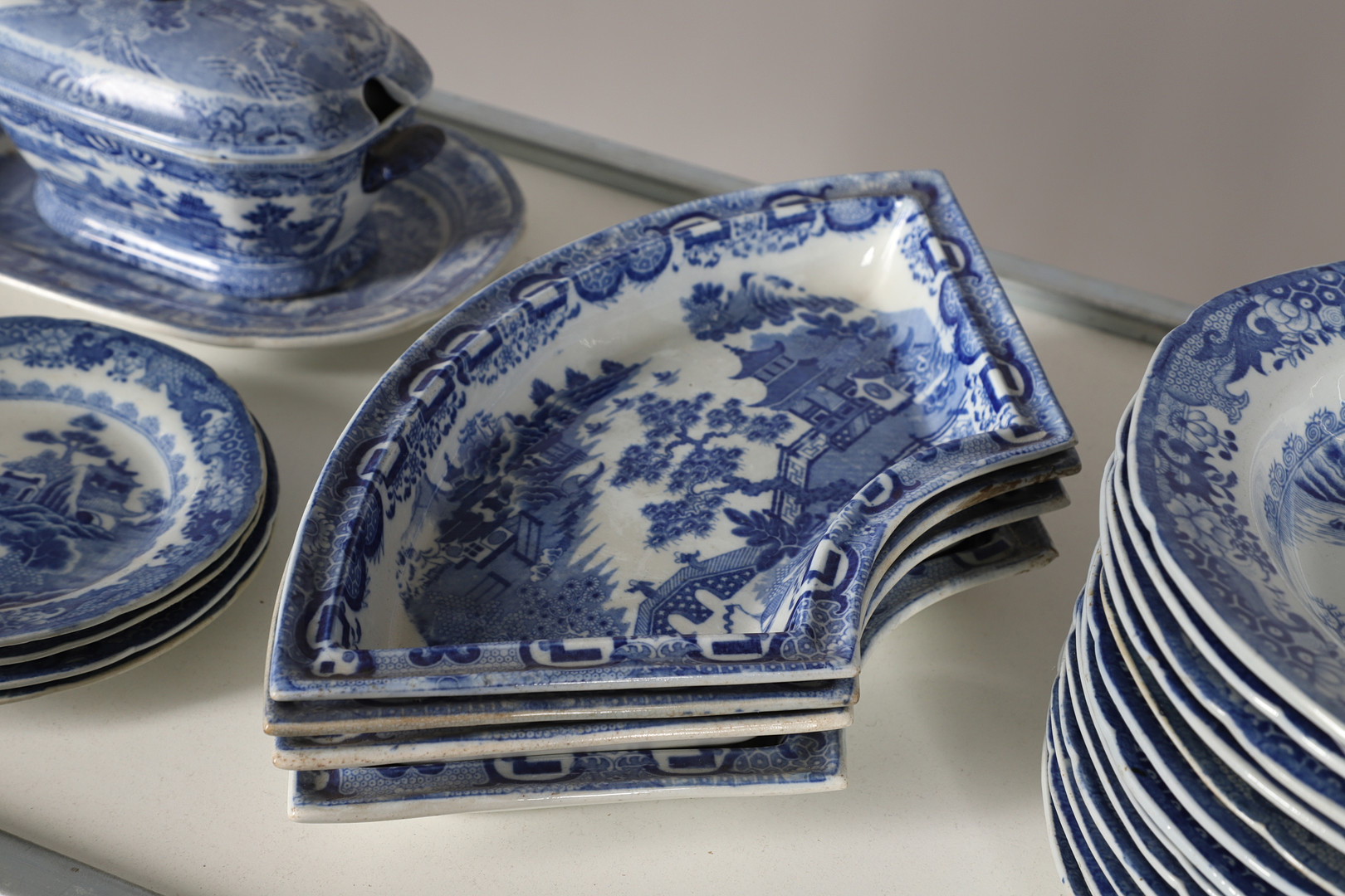 4347036. AN EARLY NINETEENTH CENTURY EARTHENWARE WILLOW PATTERN PART DINNER SERVICE.
