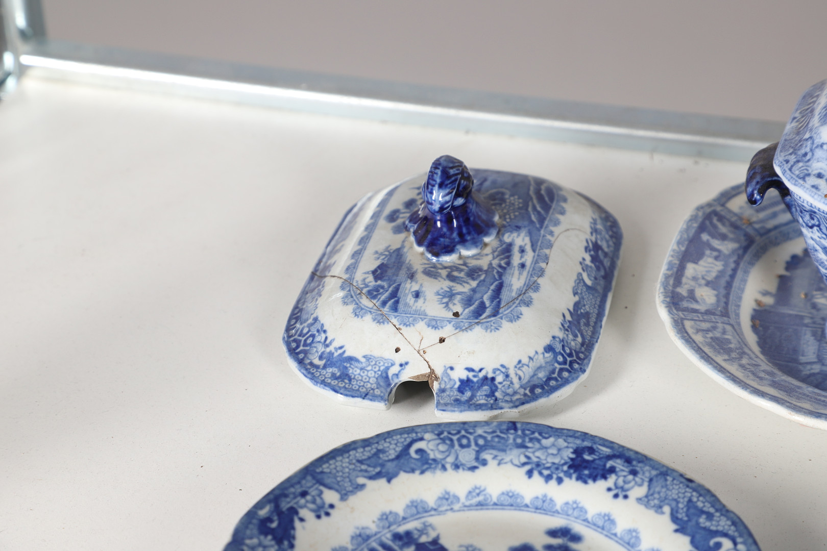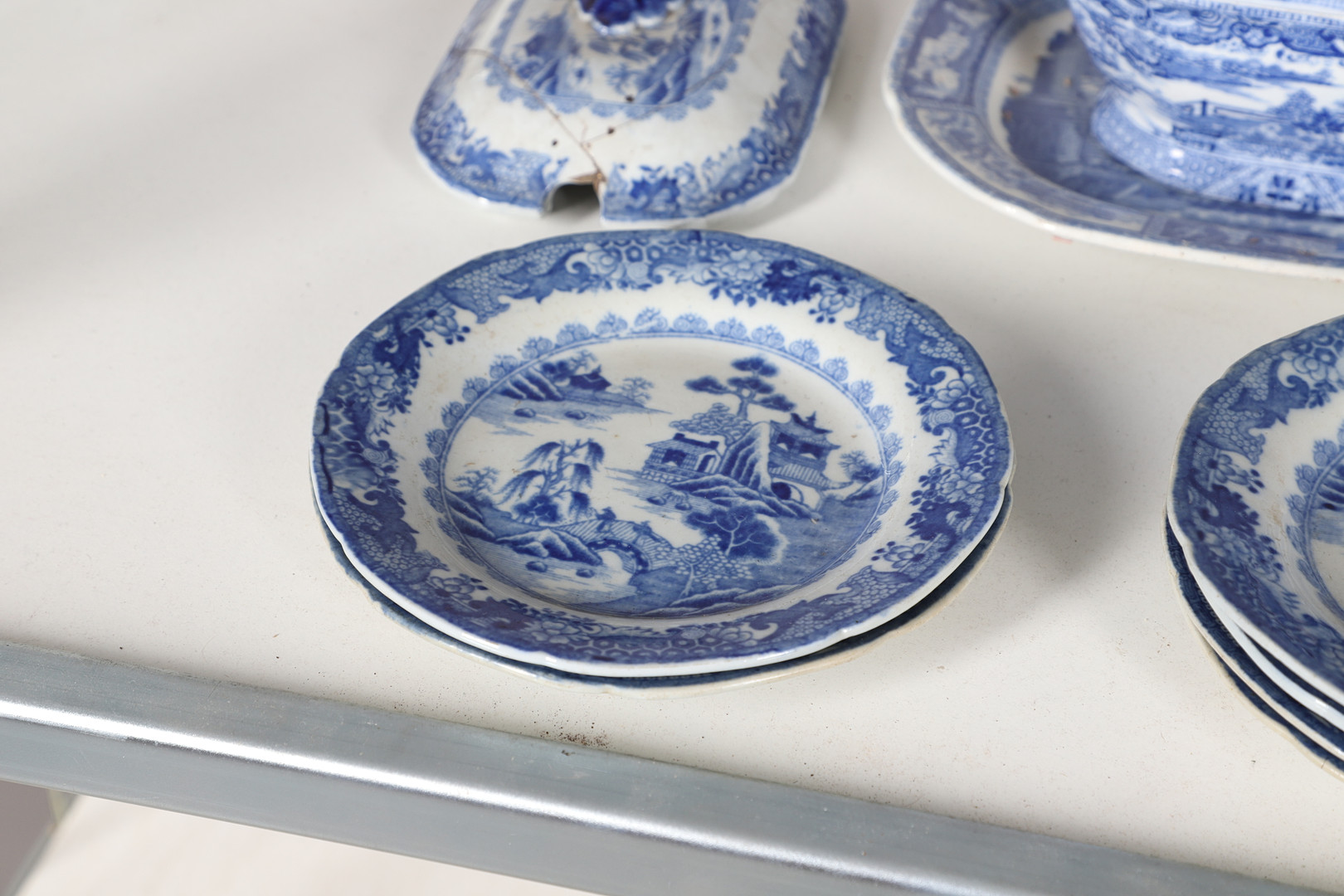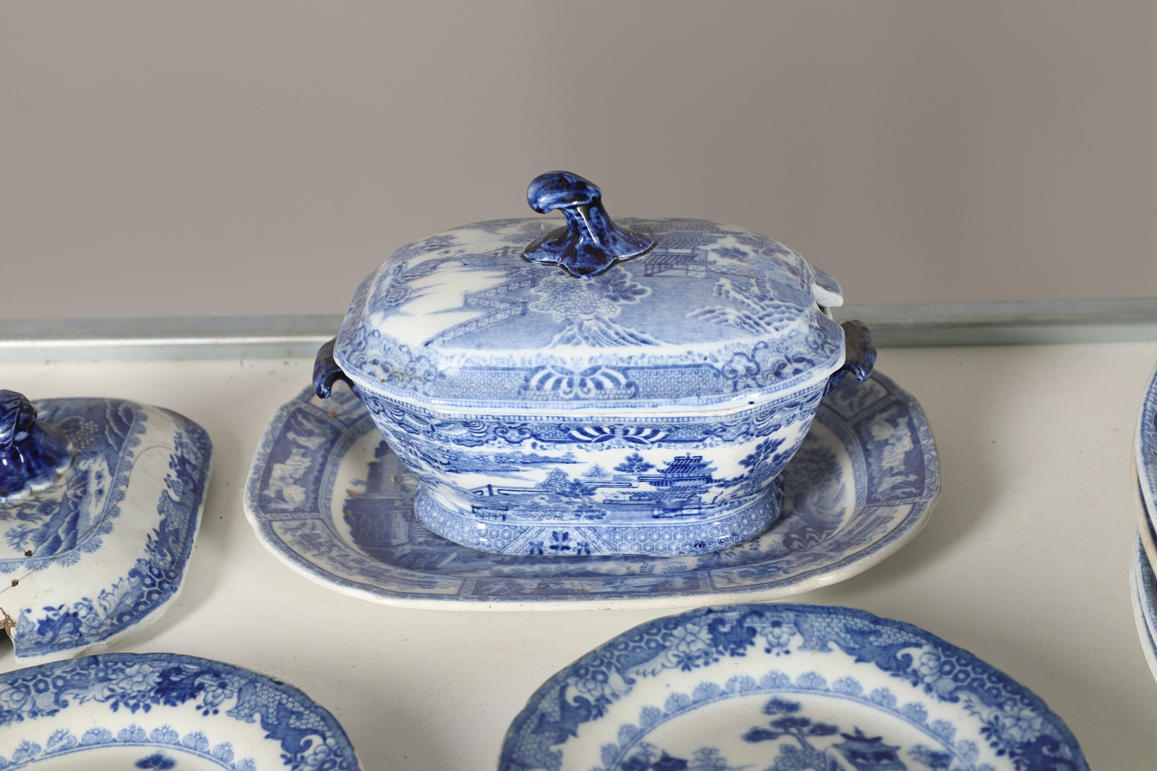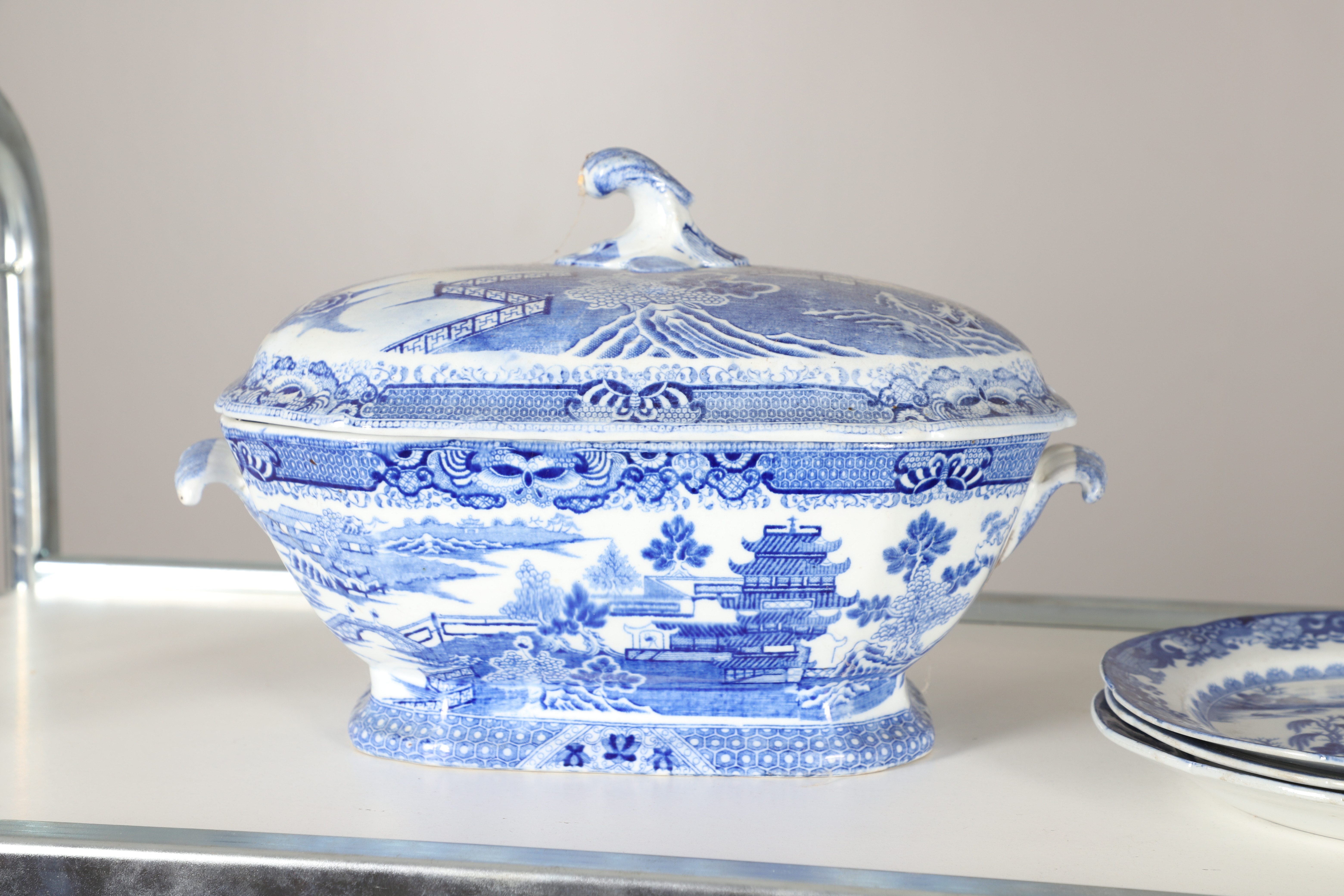 4347036. AN EARLY NINETEENTH CENTURY EARTHENWARE WILLOW PATTERN PART DINNER SERVICE.