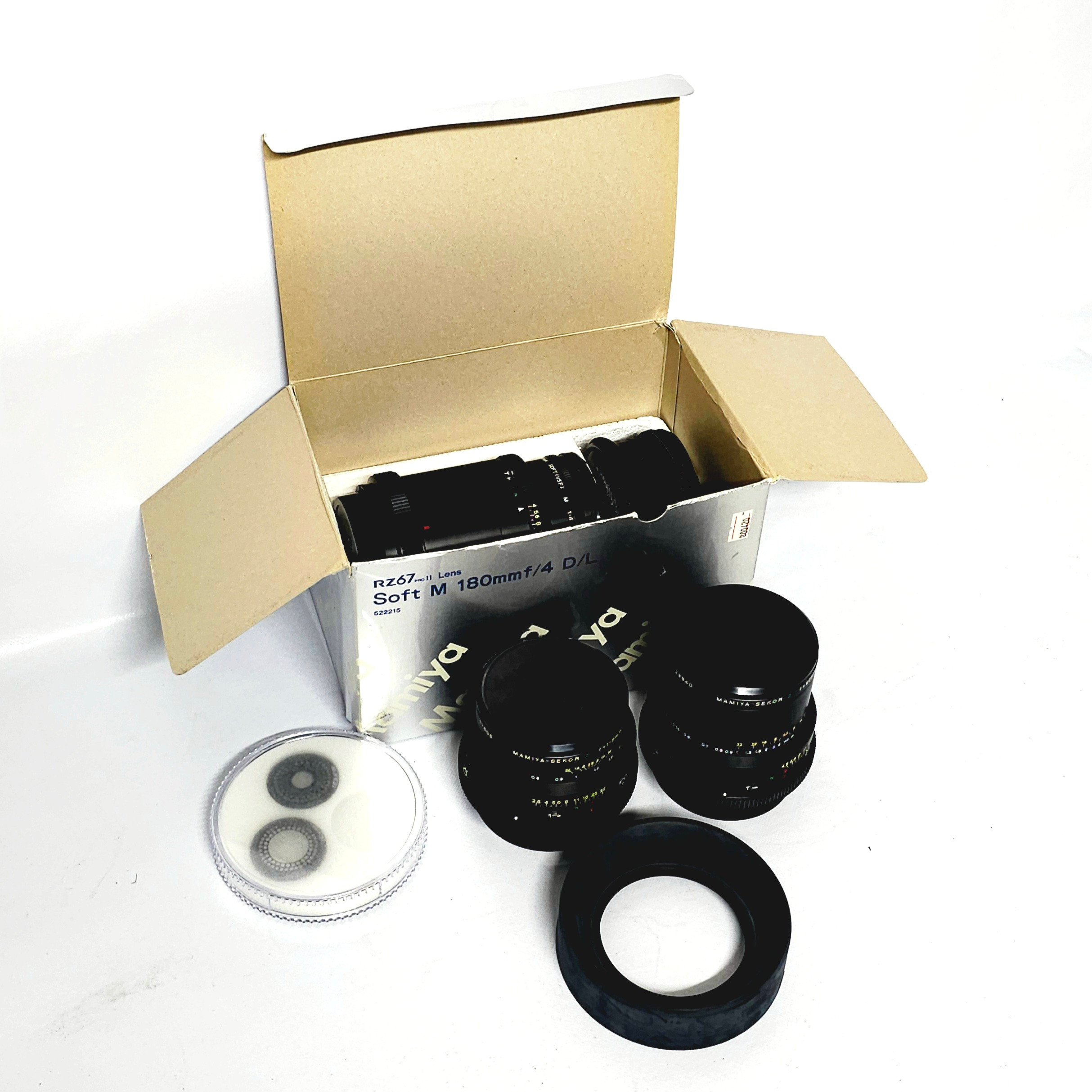 4347142. Three Mamiya objectives with accessories.