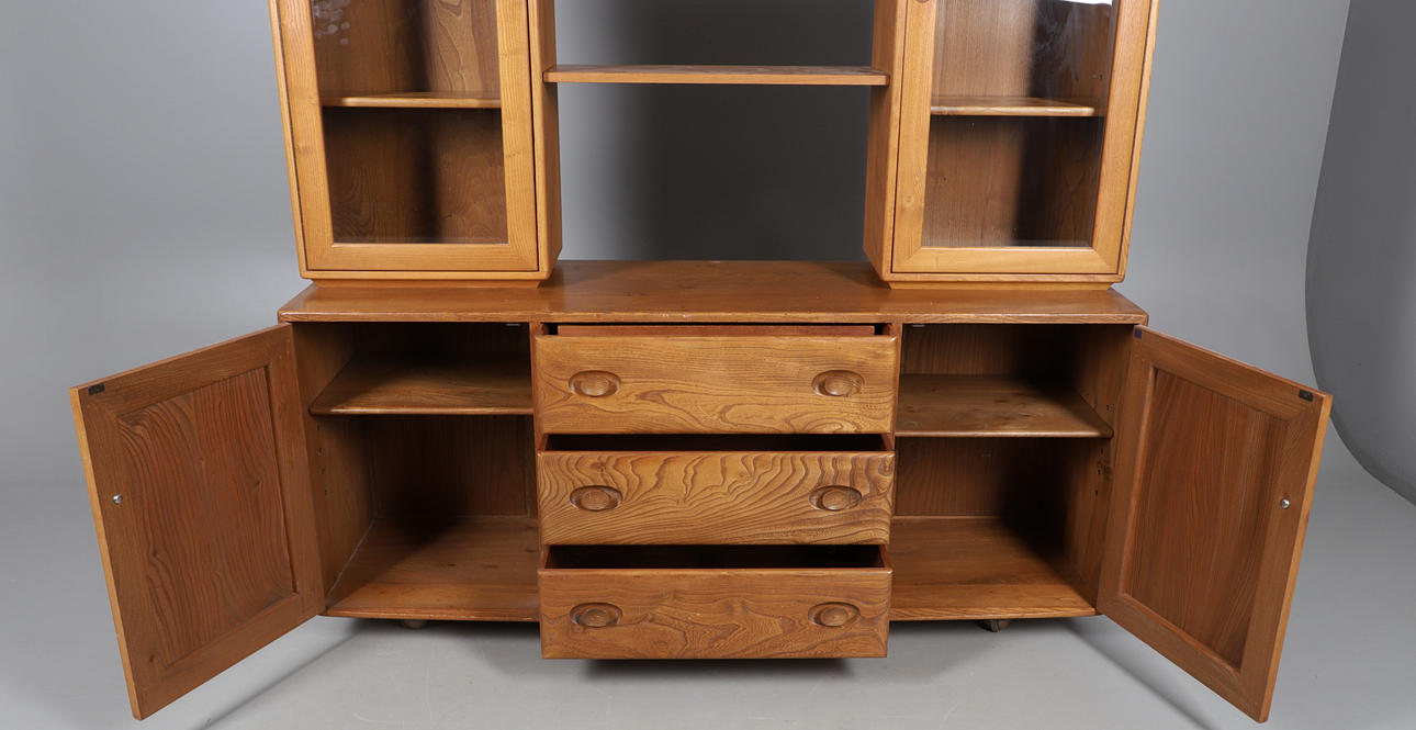 A vintage Ercol sideboard Model No 455, with three long drawers including one with cutlery, and flanked by cupboards on each side. Also with a glazed and open display cabinet section which is assembled seperataely. With various paperwork when purchased. Sideboard 155cms across by 68.5cms high, 162cms high overall