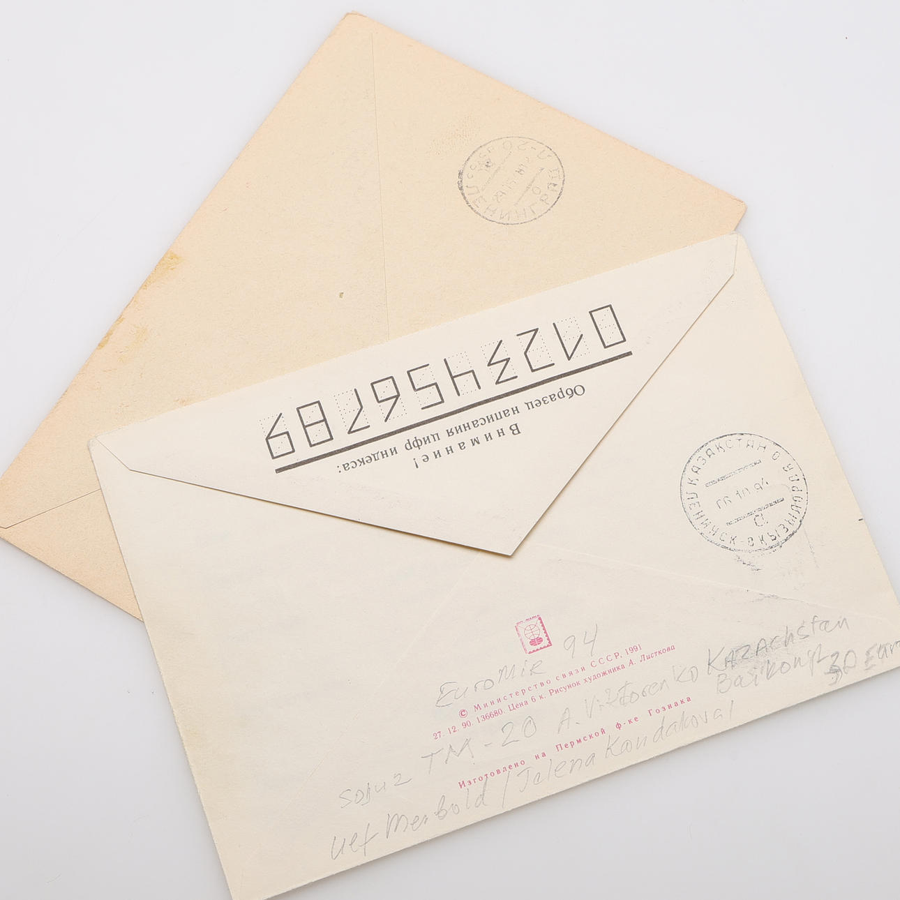 Autographs. Ten (10) signatures on two envelopes of preferentially Russian cosmonauts including Viktorenko, Kondakova -- spent 196 days aboard the MIR space station - Mergold and Bykovsky -- the rest unidentified. All proceeds go to Médecins Sans Frontières. Provenance: Uno Grönkvist's autograph collection.
