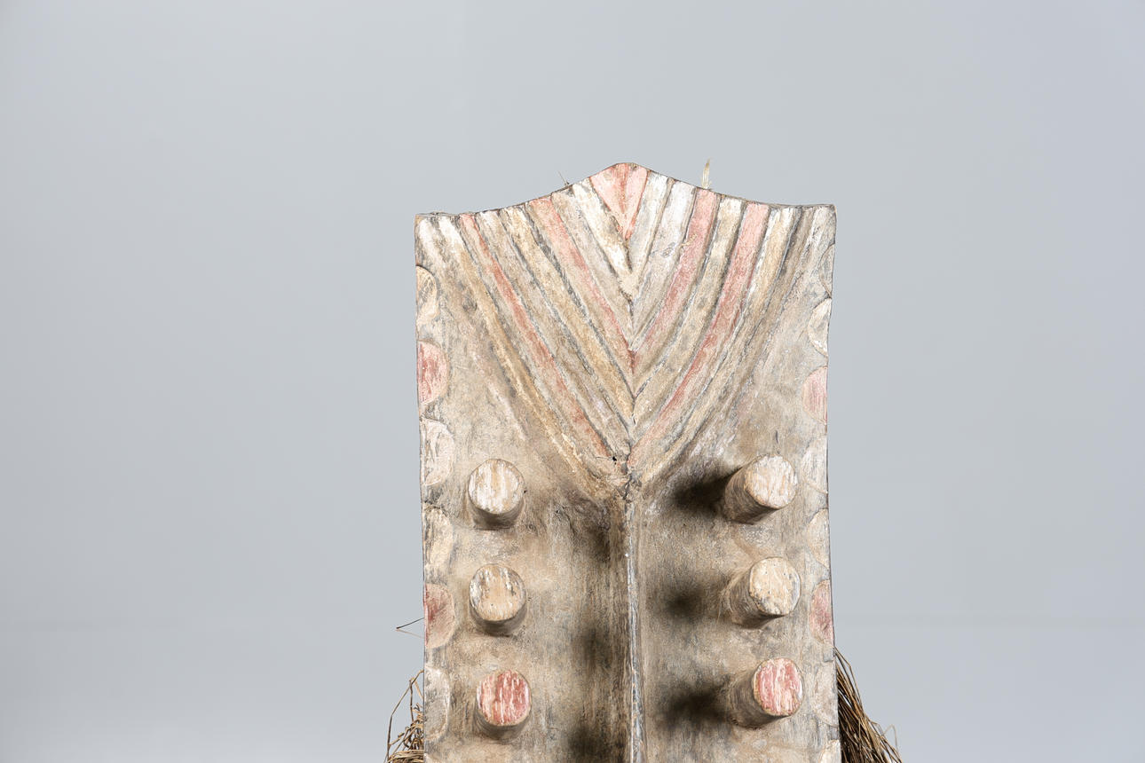 Second third of the 20th century, carved with a ridged crest with pigmentation above twelve eyes, and an elongated nose terminating to a break, 74cm high 26cm wide.