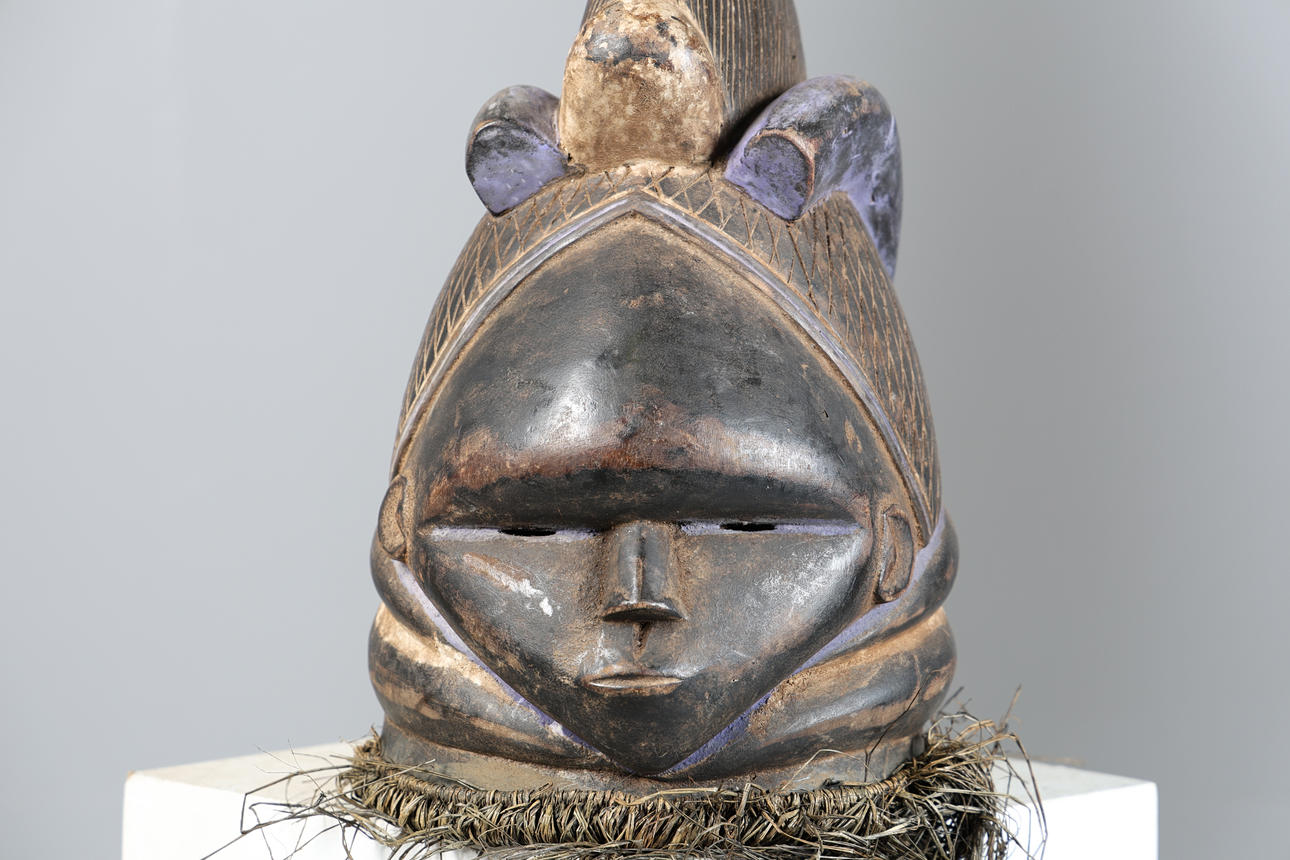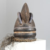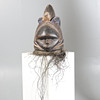 Second third of the 20th century, having a heavily carved single sided head with a wide face, and with a natural fibre base, 45cm high 23cm wide