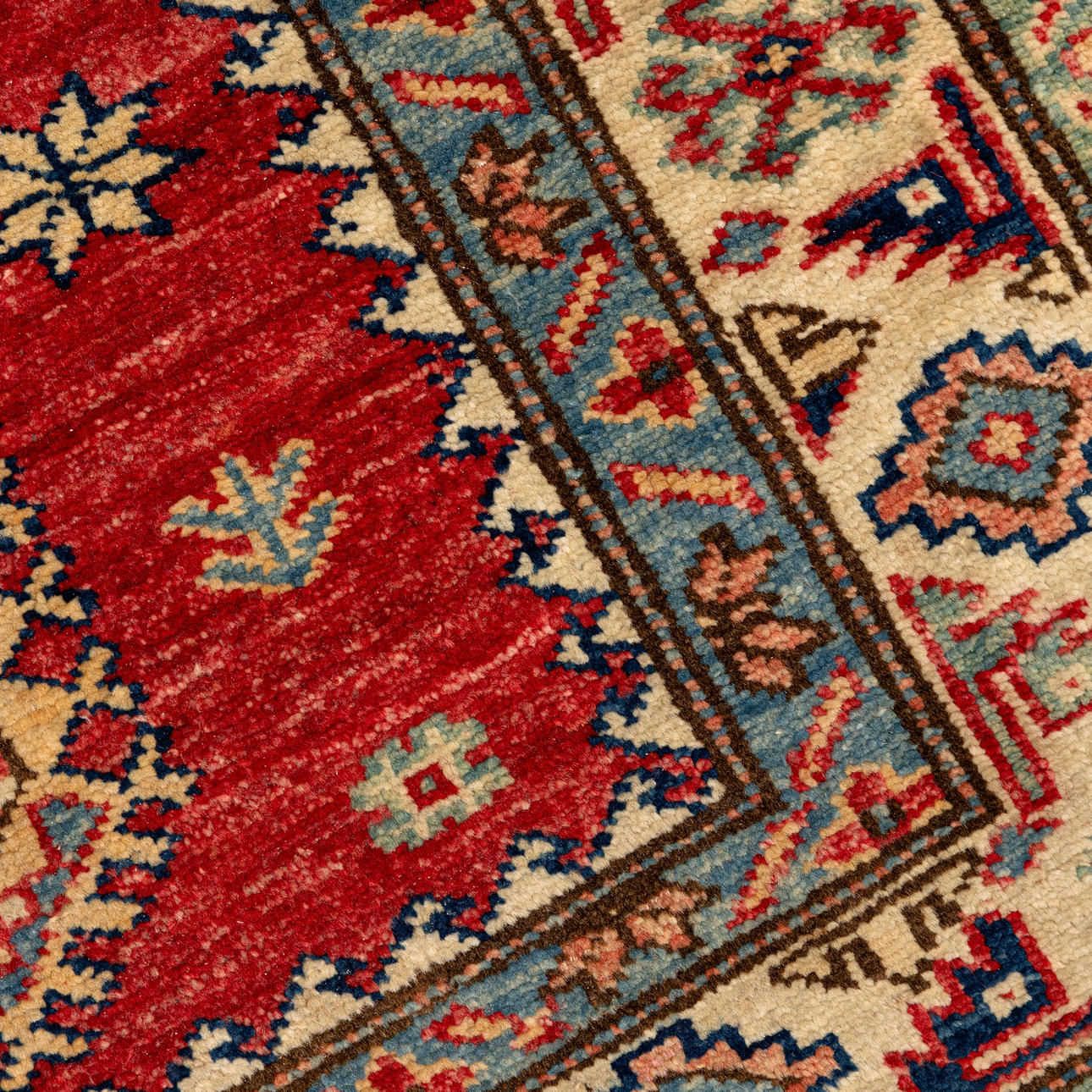 Red base with stylized medallions, in blue-green shades, border with geometric patterns against gray base. 112x85 cm and 118x78cm respectively.
