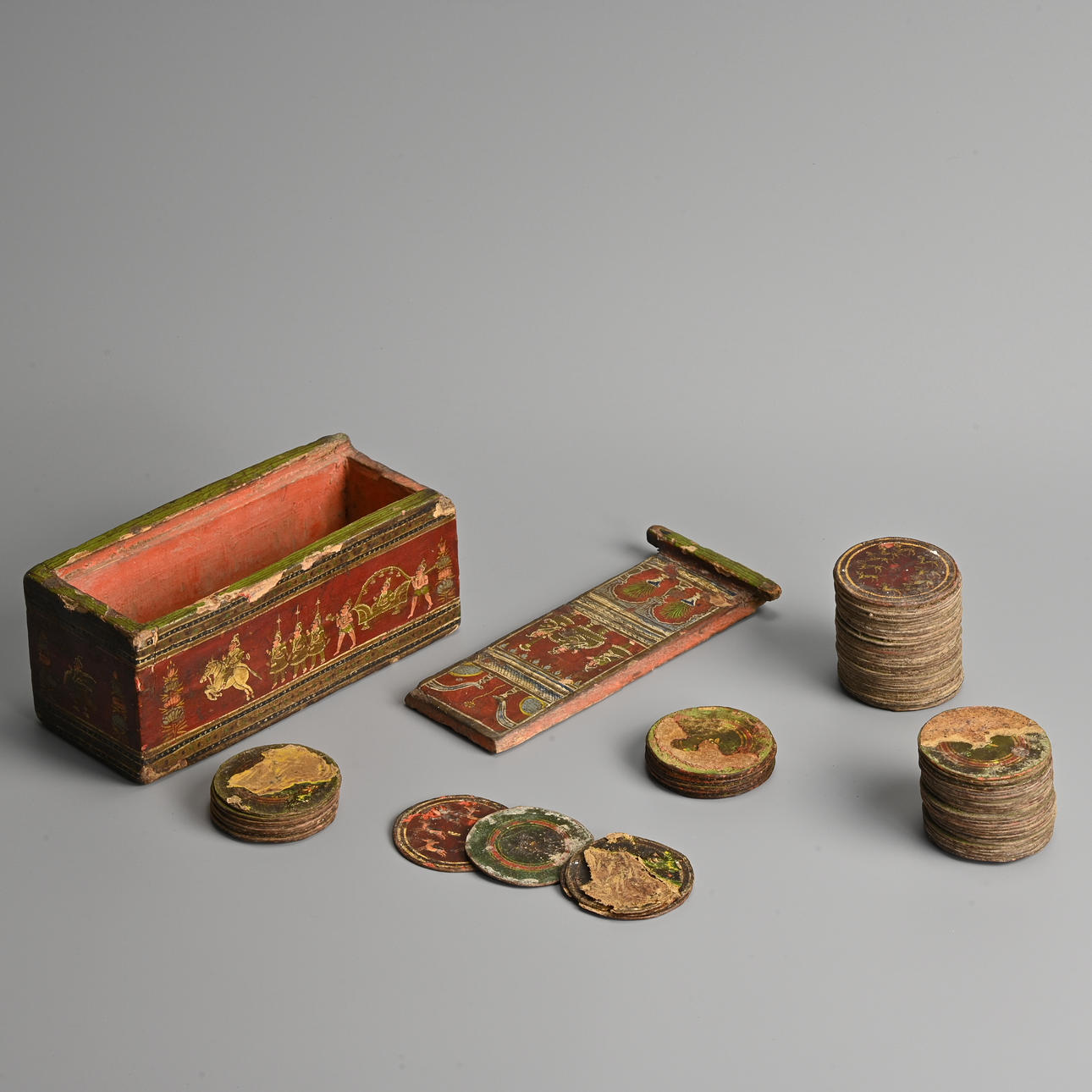 4349434. INDIAN GANJIFA GAME PLAYING CARDS AND BOXES, 19TH CENTURY.