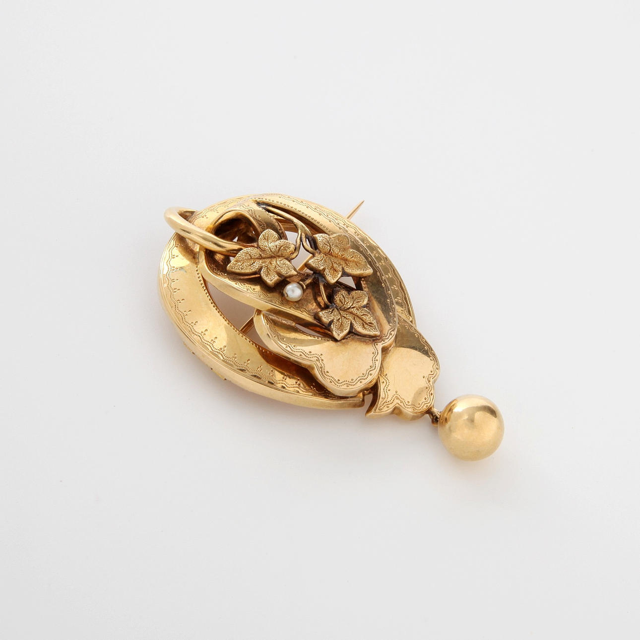 A brooch, 18K gold, decorated with vine leaves and pearls, 1884.