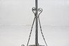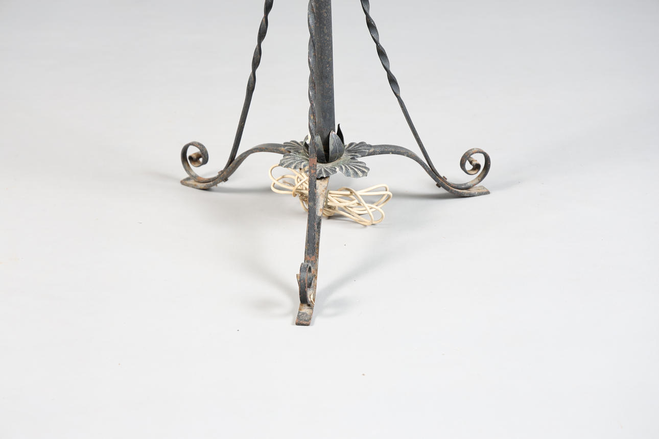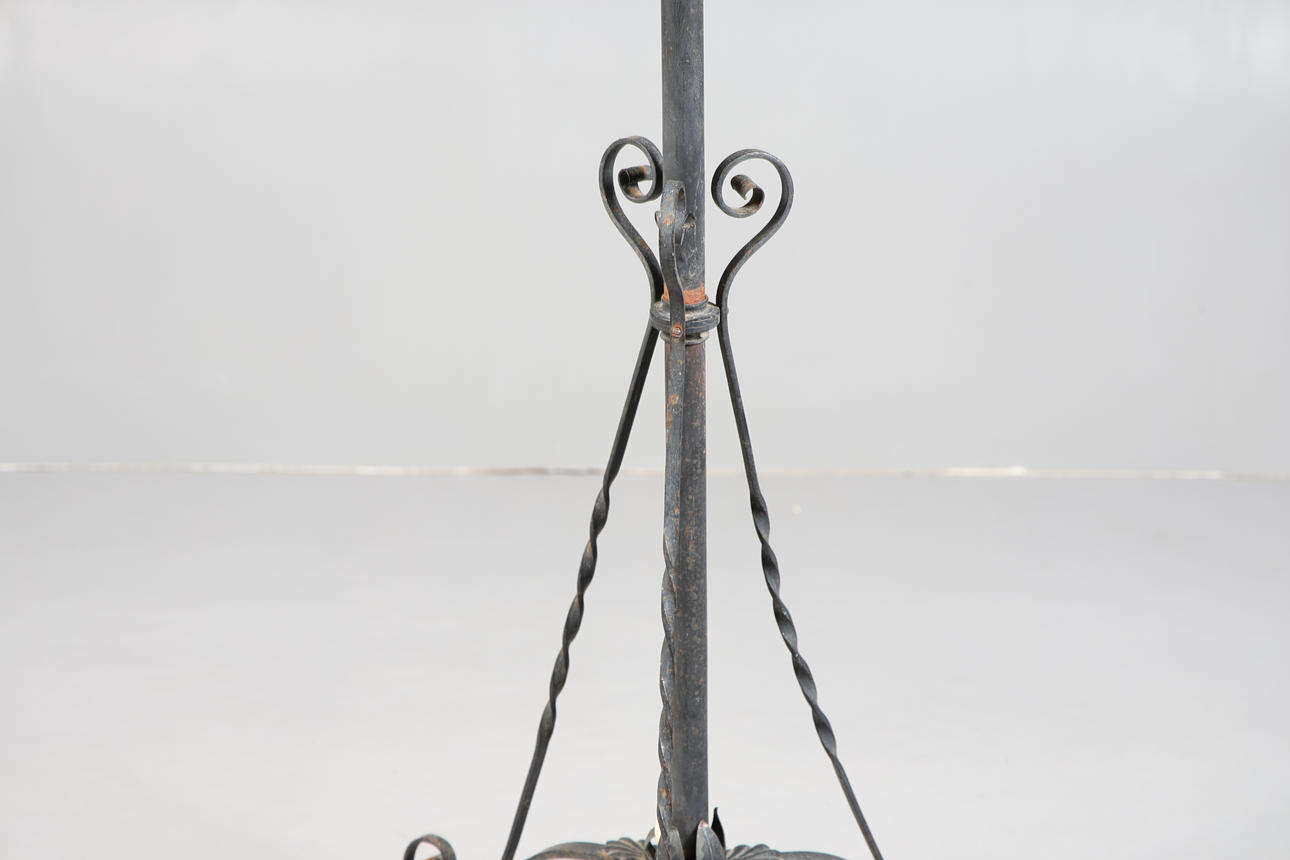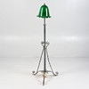 Having green glass shade with frilled rim, raised on cast iron column and four legs with paw feet, 153cm tall approx.