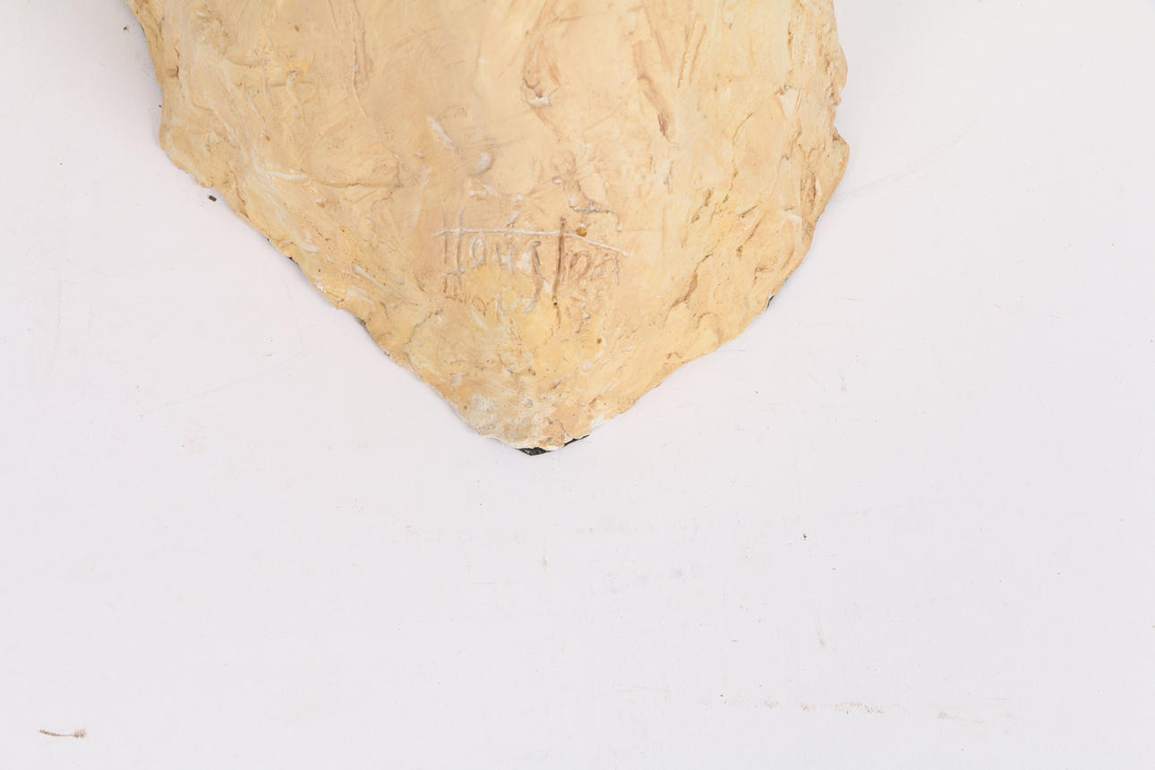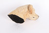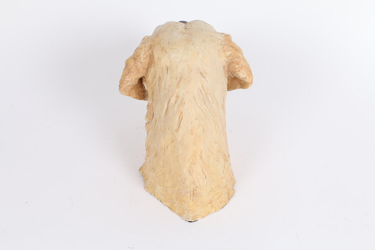A painted resin sculpture of a dogs head, 24cm high.