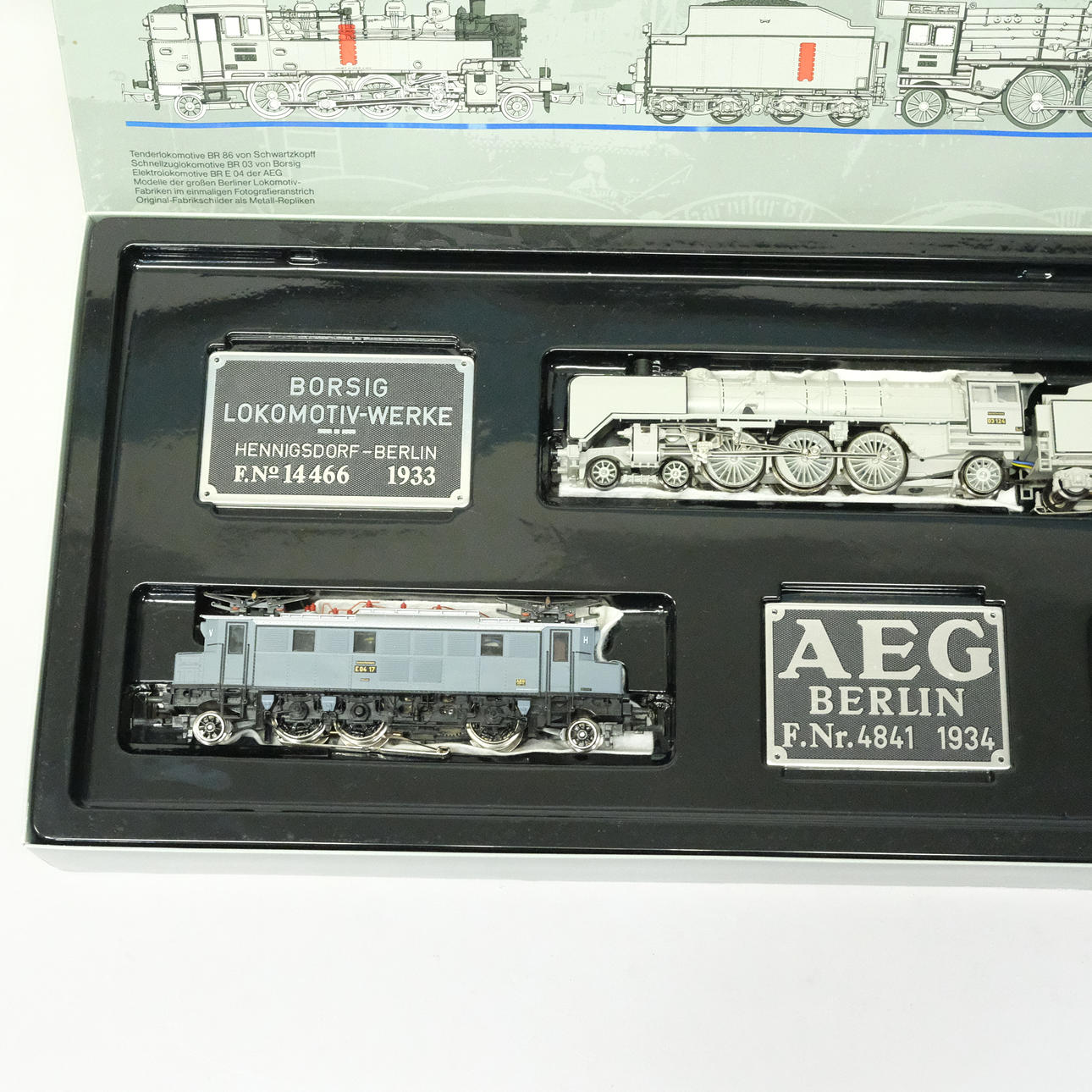 Steam locomotive with coal carriage, BR 03, steam locomotive, BR 86. Electric locomotive, E 04, with original carton.