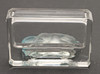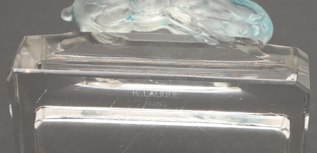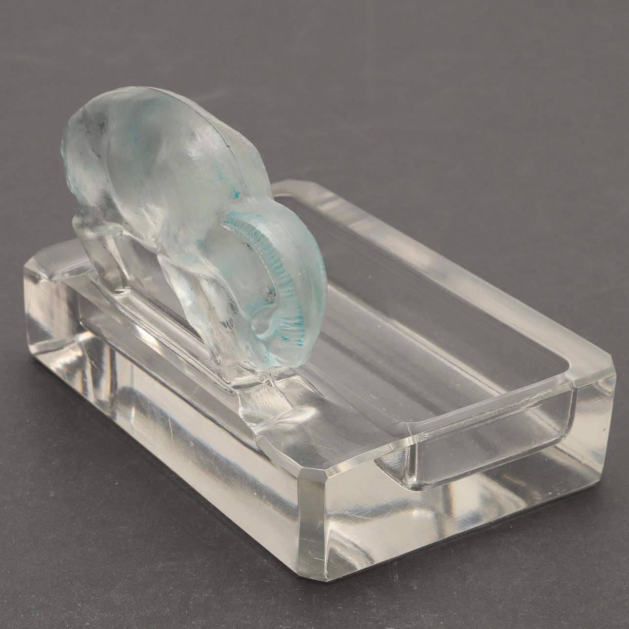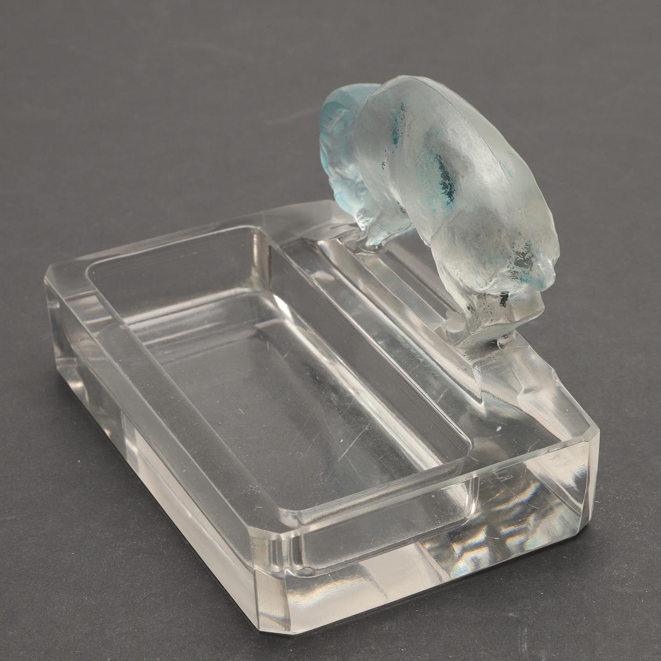 A lalique clear glass dish mounted with a goat with blue staining, etched mark to the vase 'R Lalique'. 11cms by 8cms.
