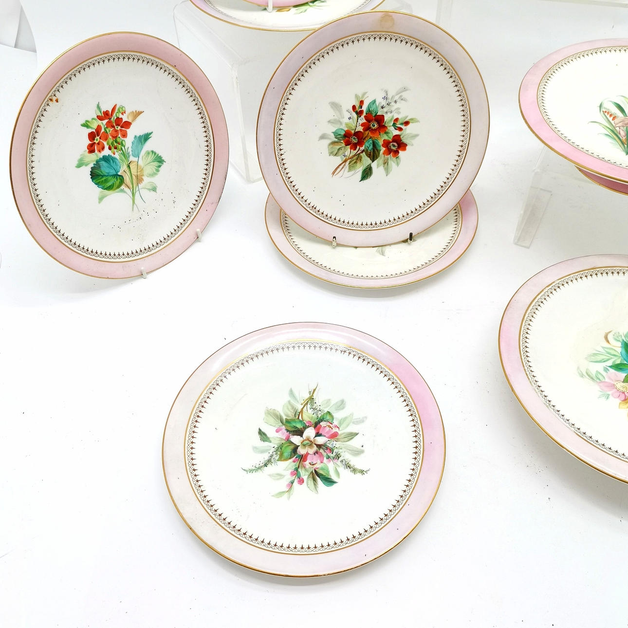 Antique flower decorated dessert plates (23cm diameter) & tazzas.