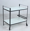 Bar trolleys/serving trolleys, metal construction, glass shelves, plastic wheels, Dimensions approx.: H. 72 cm, W 71 cm, depth 45.5 cm.