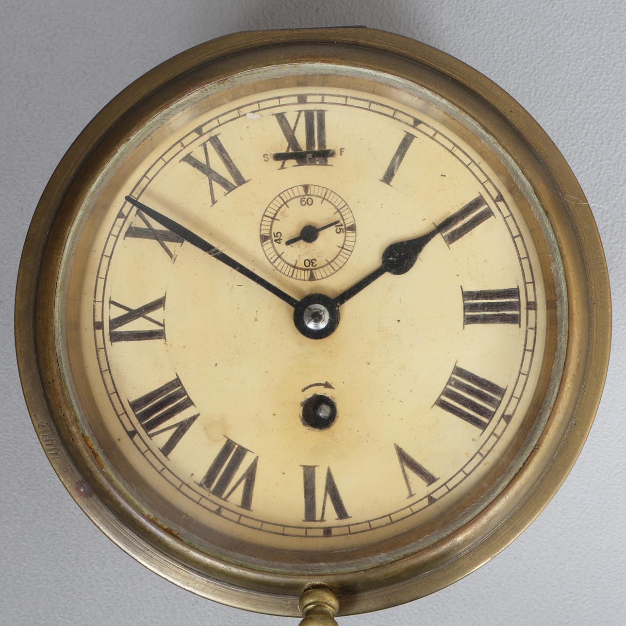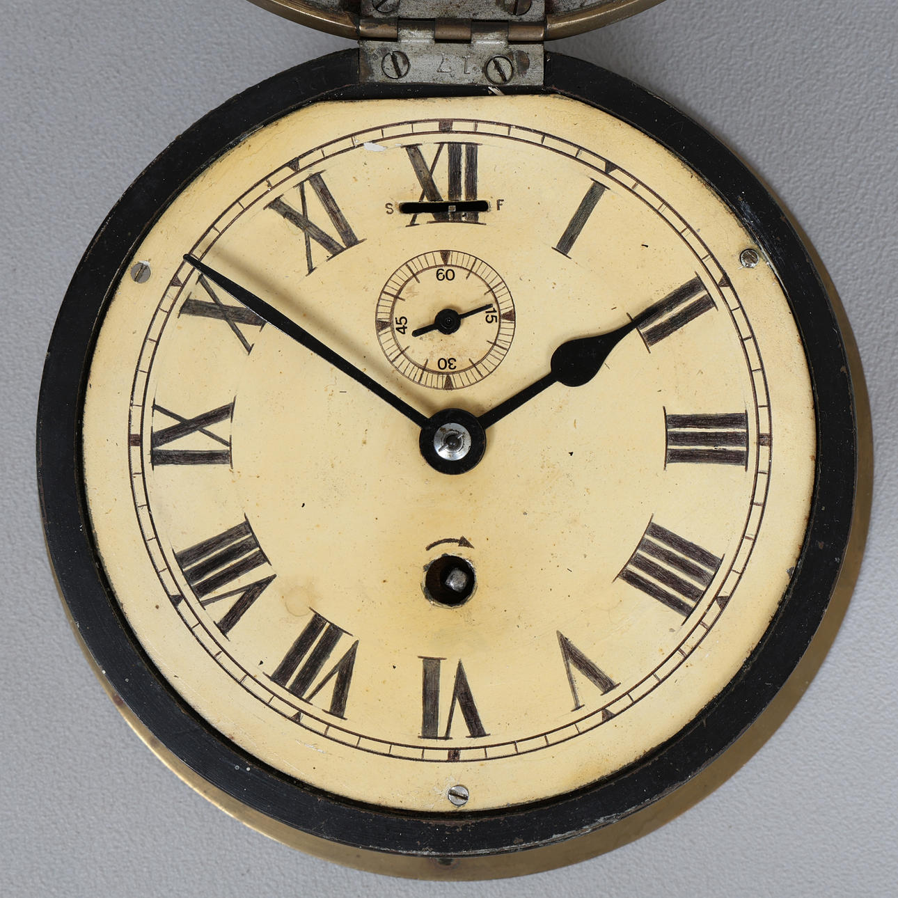 Having a cream dial with Roman numerals and a outer minutes track, together with a subsidiary seconds dial, 20.5cm diameter.