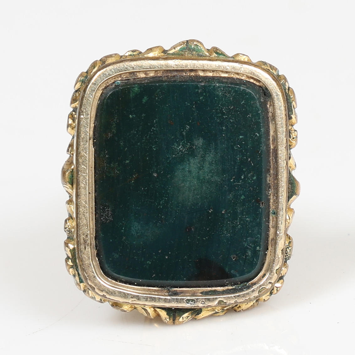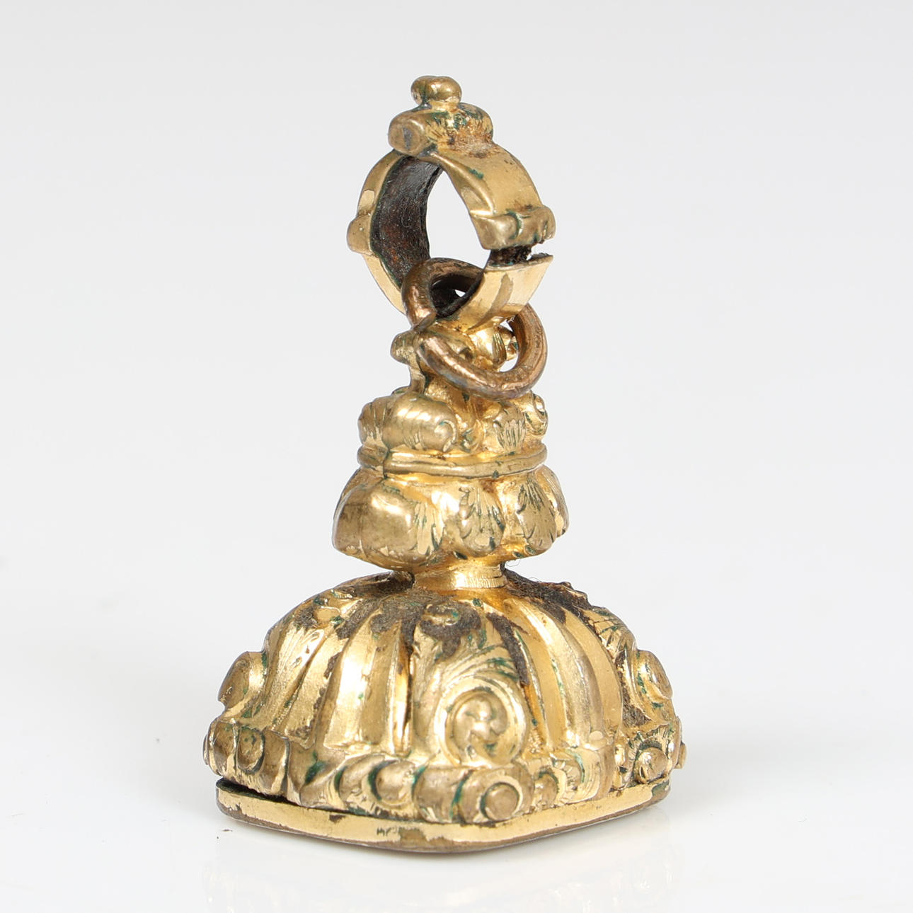 The body with cast scroll decoration and with vacant hardstone matrix, 3.5cm high.