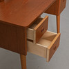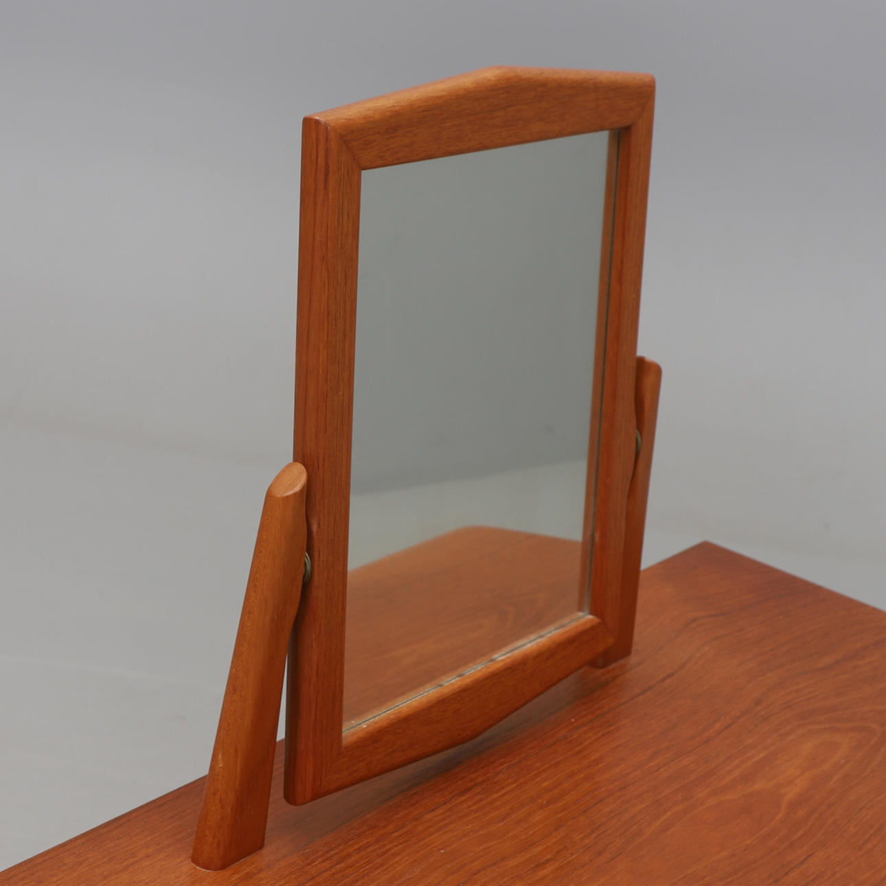 Teak with legs of beech. 3 boxes, adjustable mirror. Height 114, width 87, depth 40 cm.