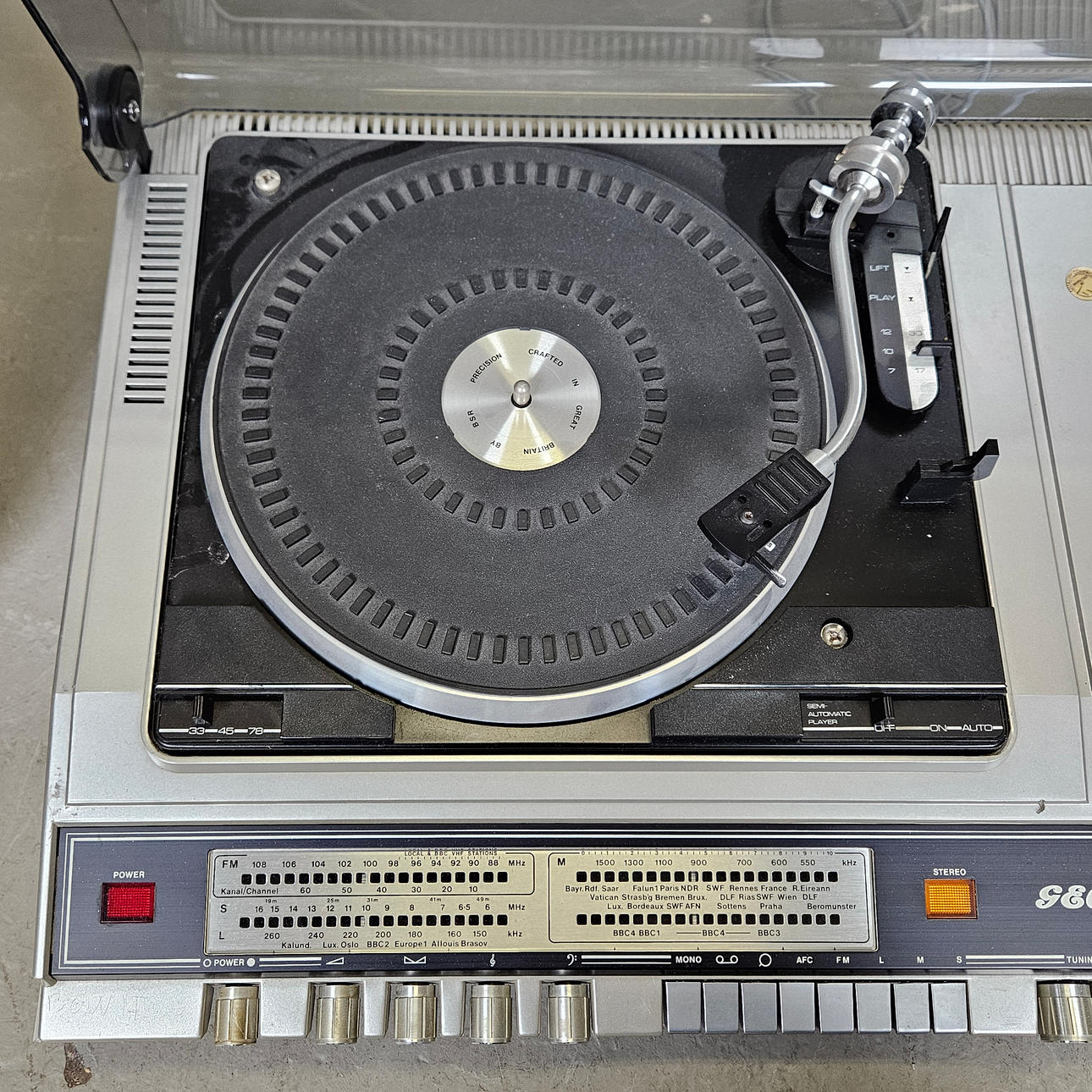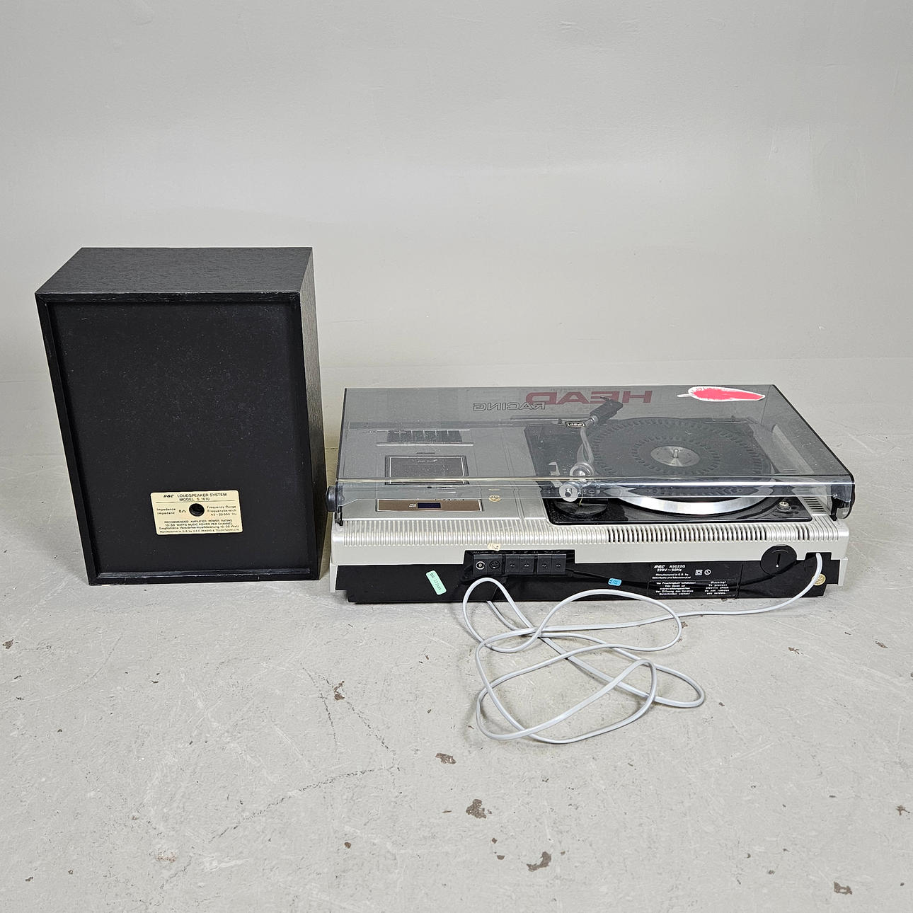 Turntable with radio, cassette player, length approx. 65 cm. Loudspeaker, height approx. 40 cm.
