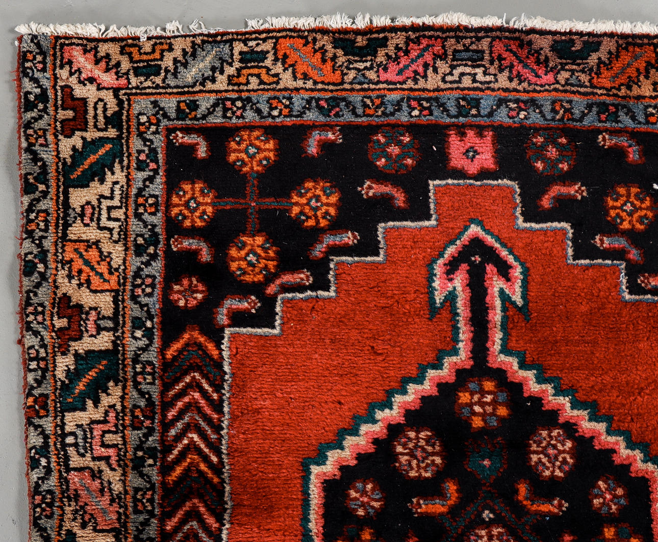 Hand knotted, wool on cotton warp, 320x105 cm.