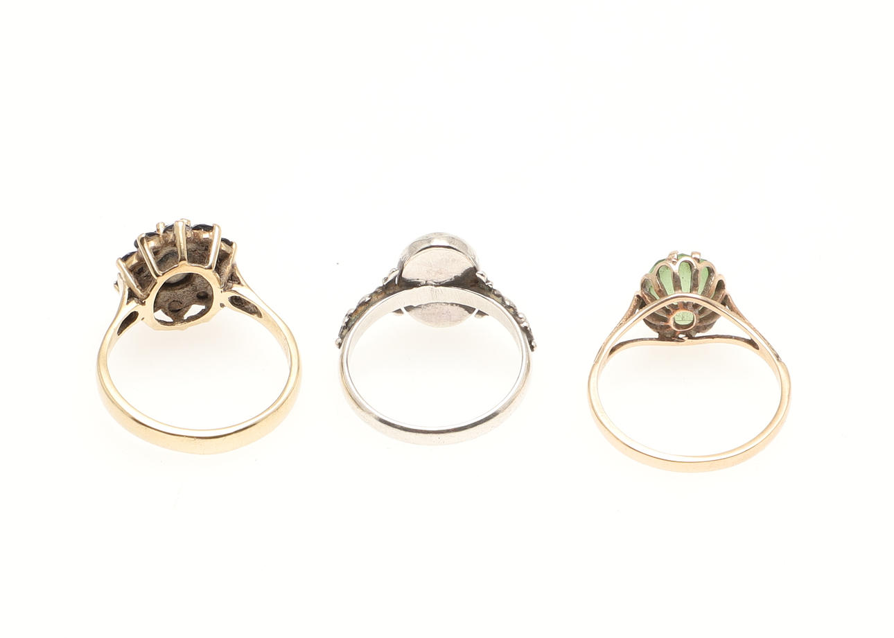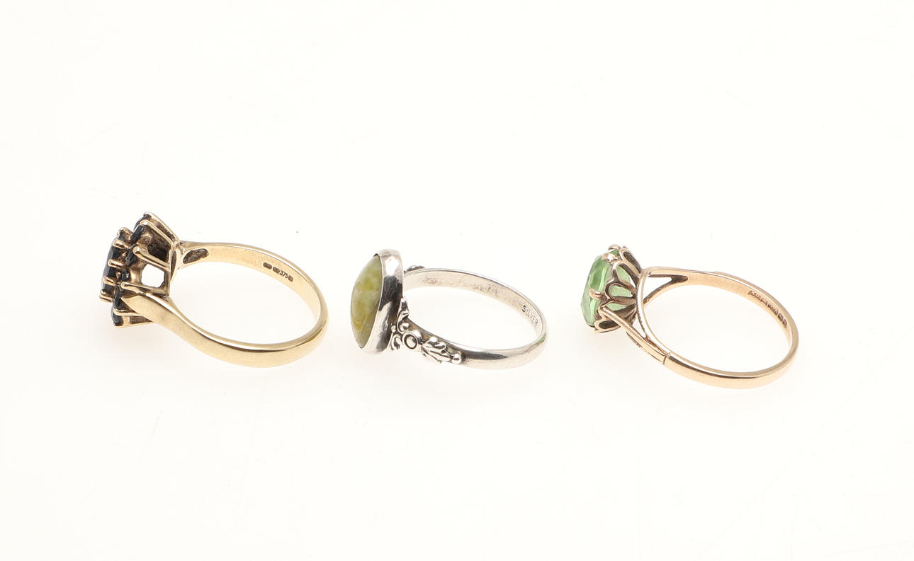 A sapphire cluster ring, together with a green quartz single stone ring, total 9ct 5.7g and a silver ring.