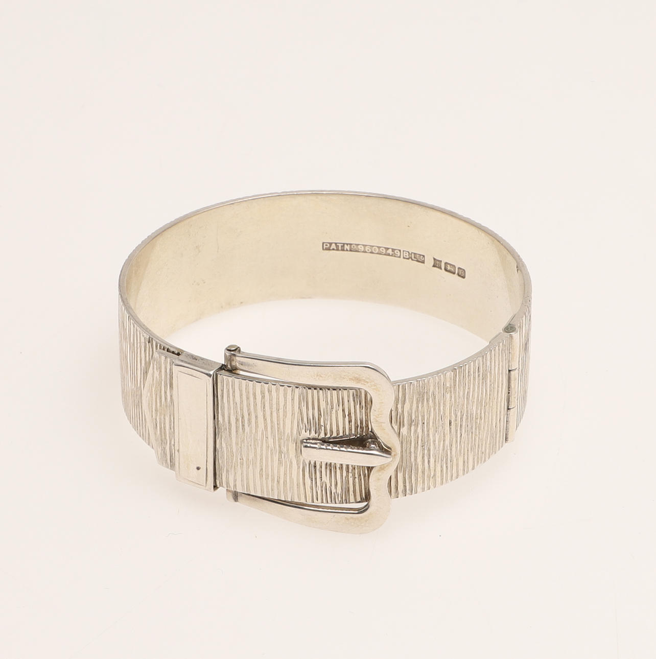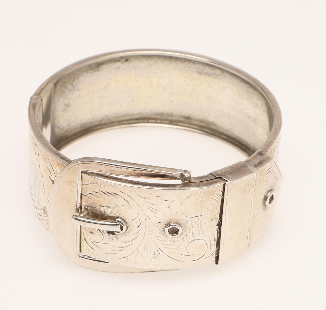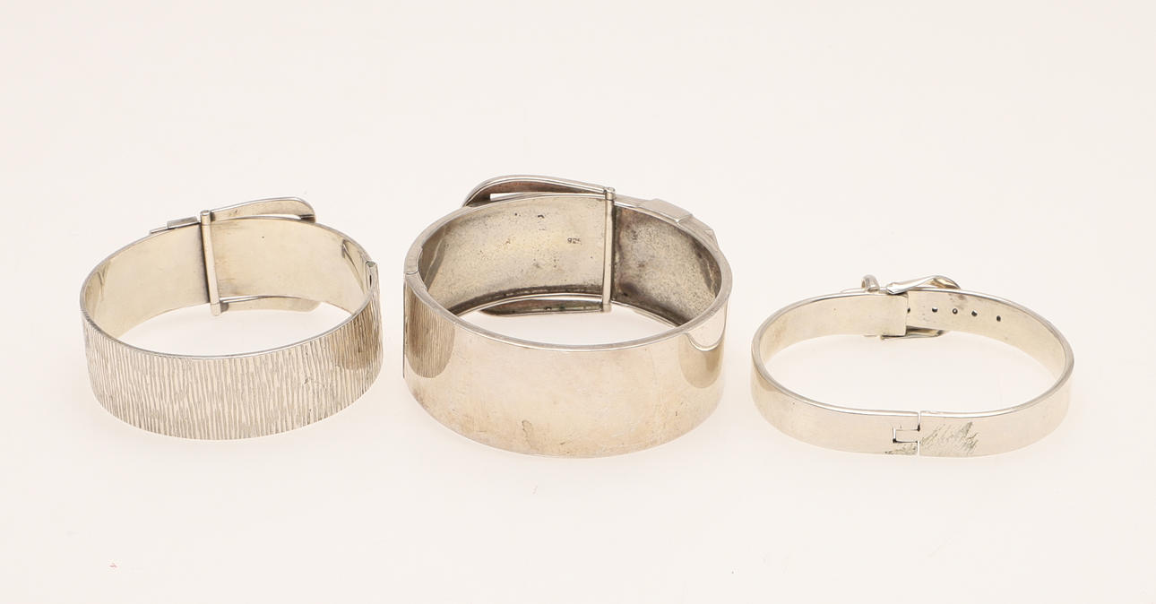 4353318. THREE SILVER BUCKLE BANGLES.