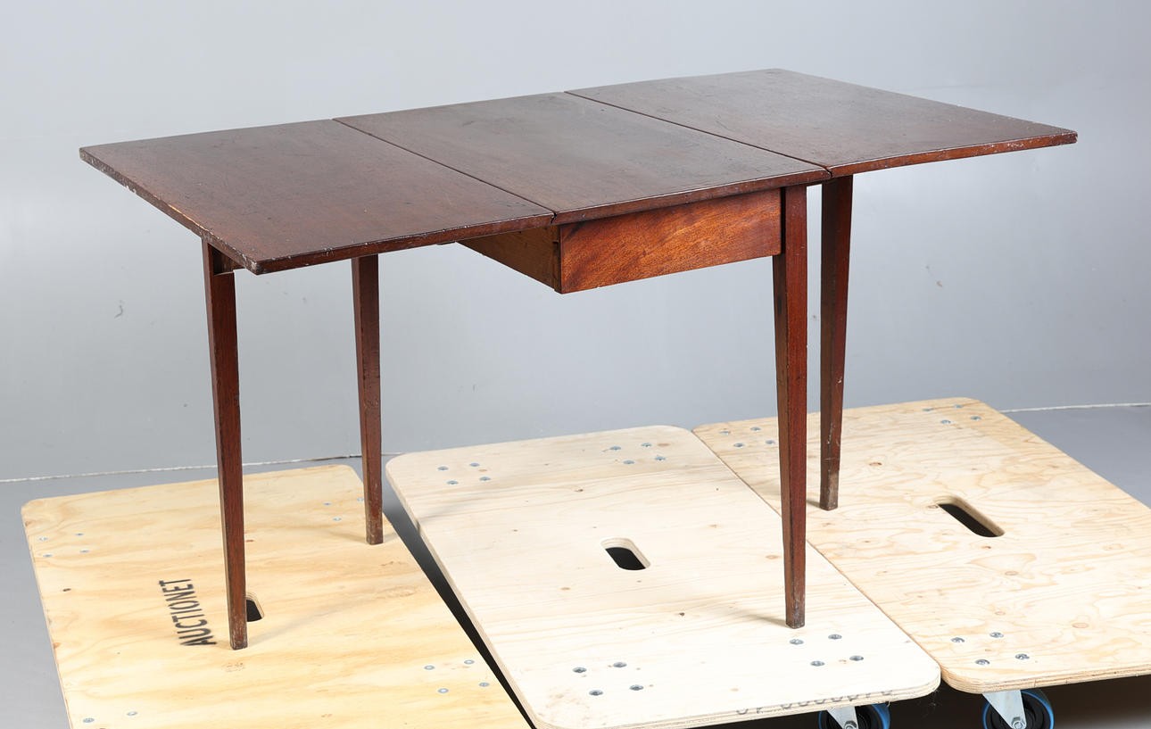 The rectangular top with a pair of drop leaves above tapering legs, 78cm wide 72cm high 46cm deep.