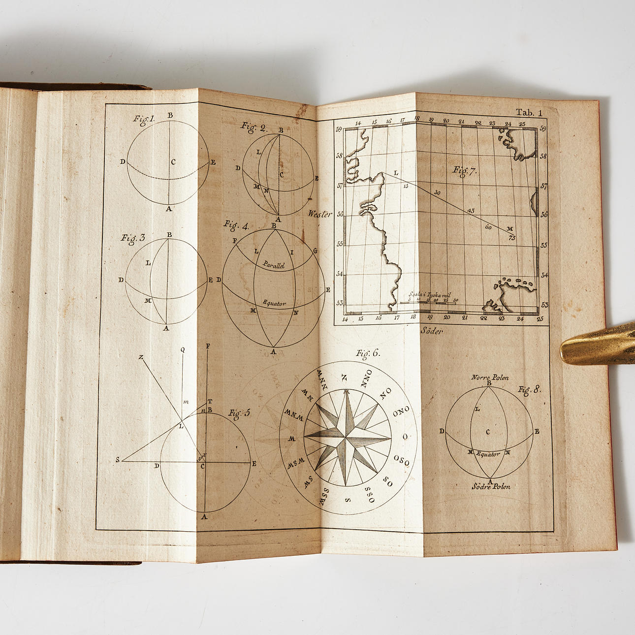 8th (about 200 x 130 mm.). (12), XXXII, (2), 316, (2; (12), 360; (16), 360, 14 foldable engraved planks. Contemporary uniform all-leather bands with five raised bindings and richly gold ornate backs, gold band numbering and titles on the backs, red title fields, red incisions, marbled front and post leaves. 3 volumes.