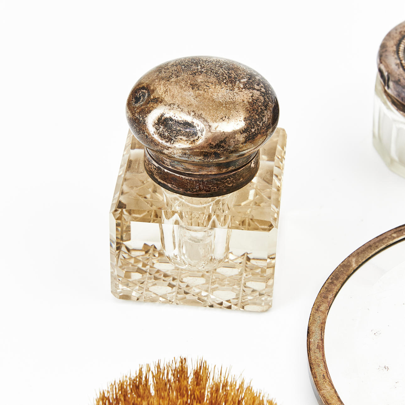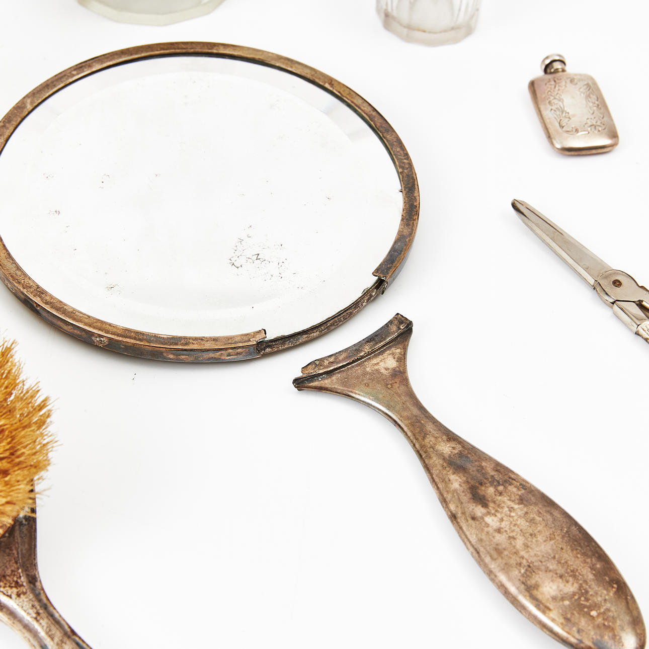 Broken mirror, engraving, smaller bottle without cork, dents, marks.