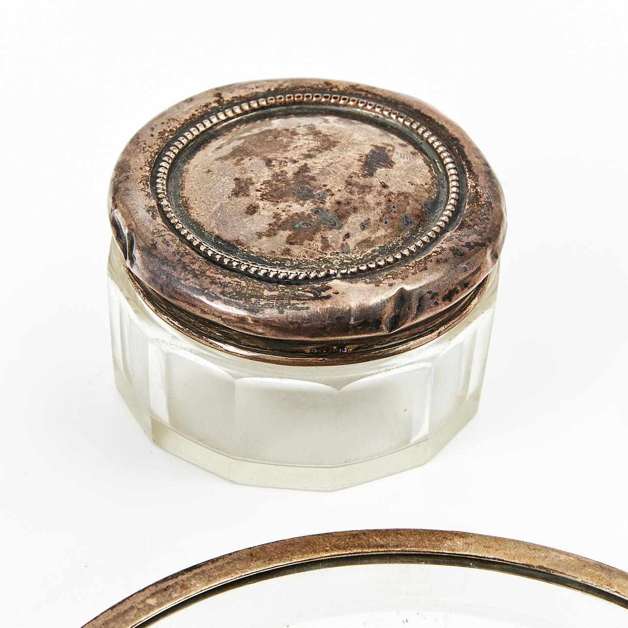 4354756. BRUSH, HAND MIRROR, PILL JARS, SCISSORS, etc., silver, single sterling, 8 pieces.