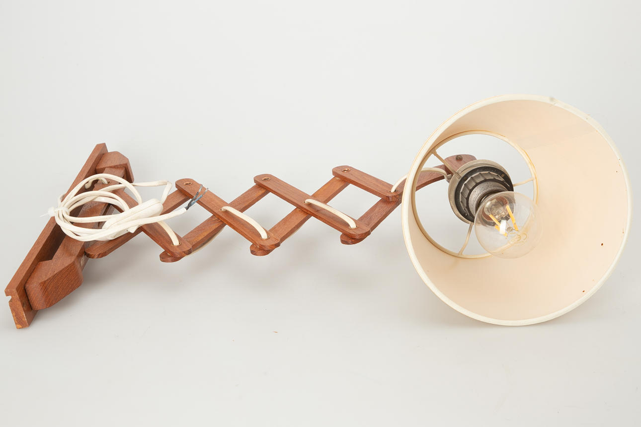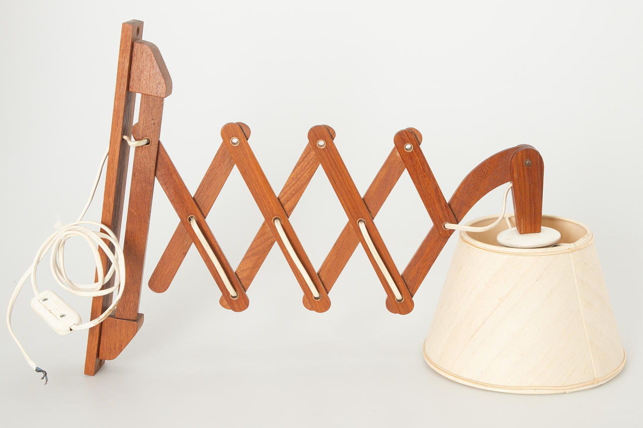 Retractable teak bracket One burner, E27 socket. Adjustable lamp head with shade, covered with fabric.