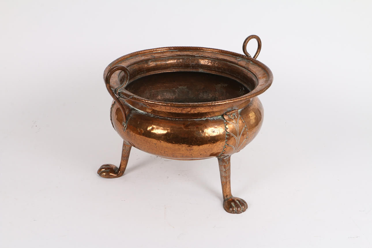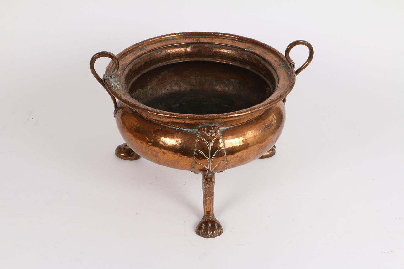 4355212. AN ARTS AND CRAFTS DECORATIVE HAMMERED COPPER CAULDRON.