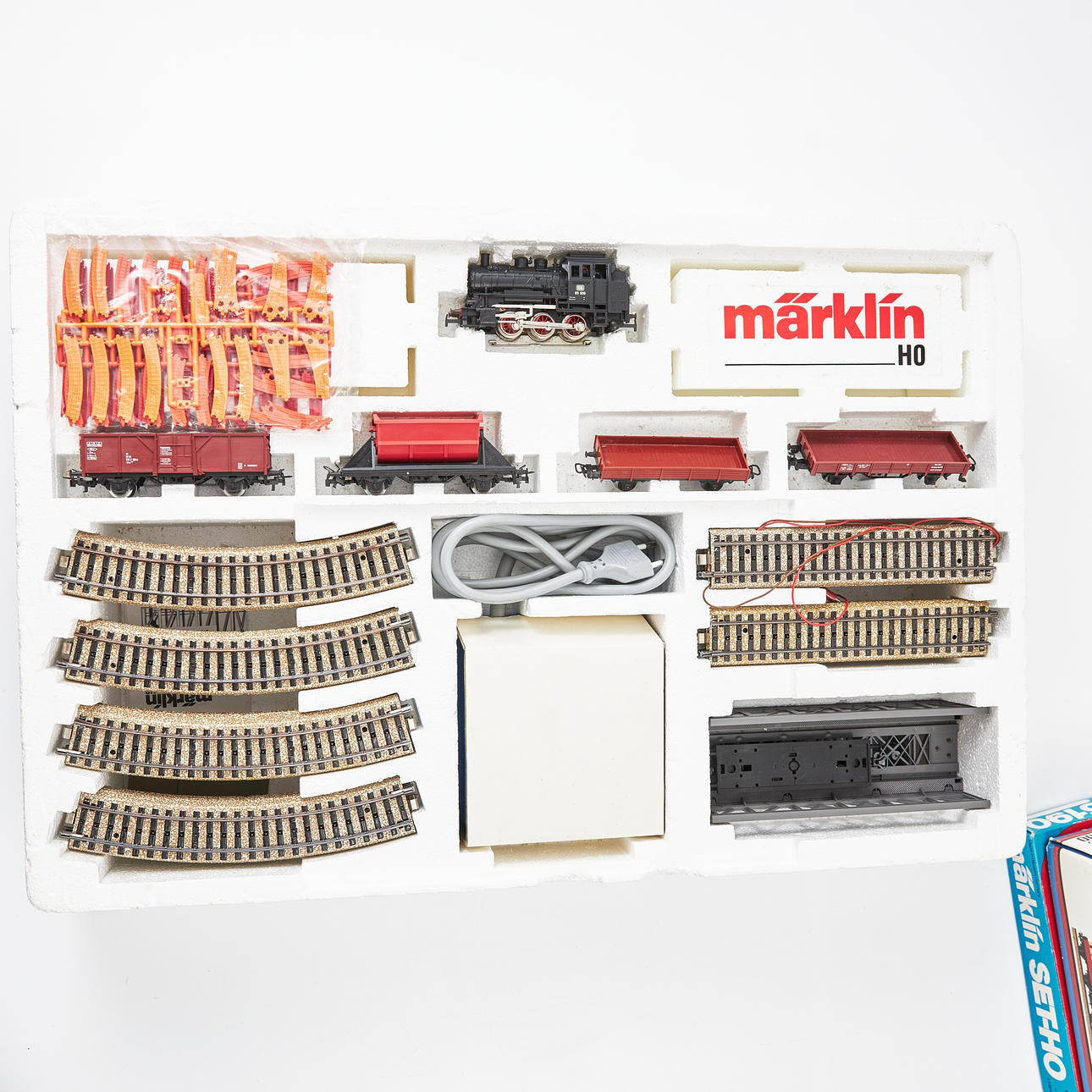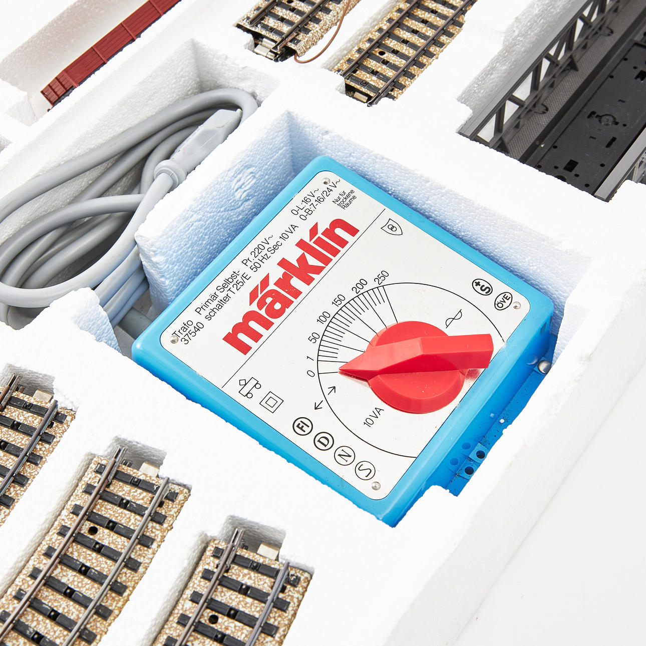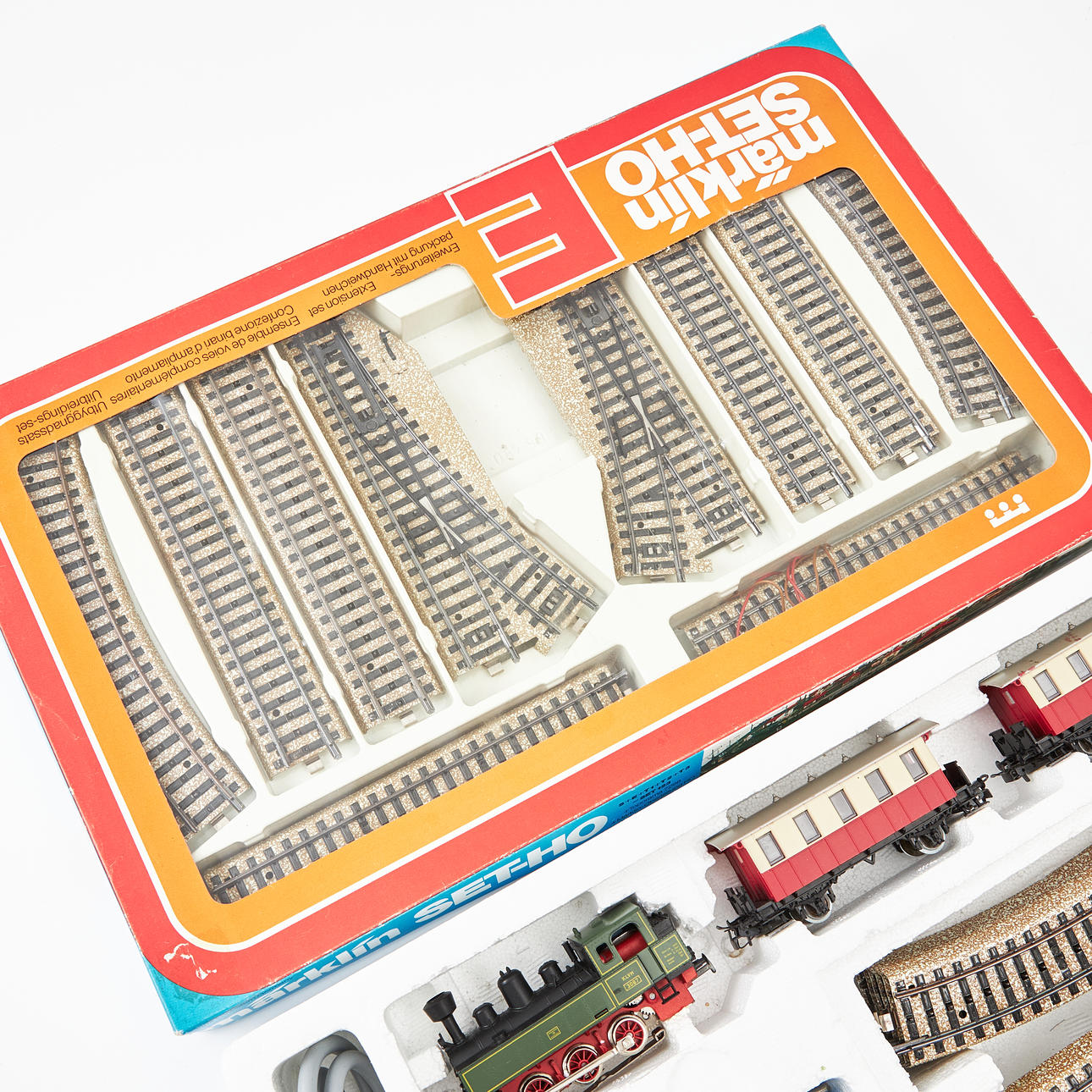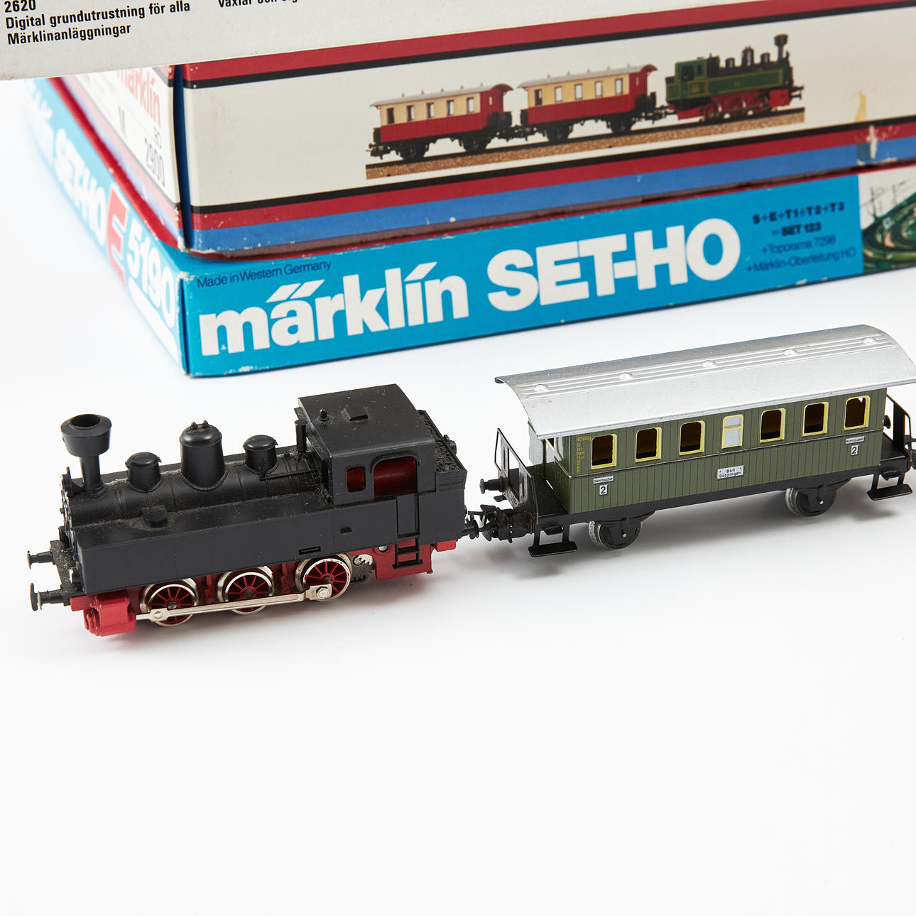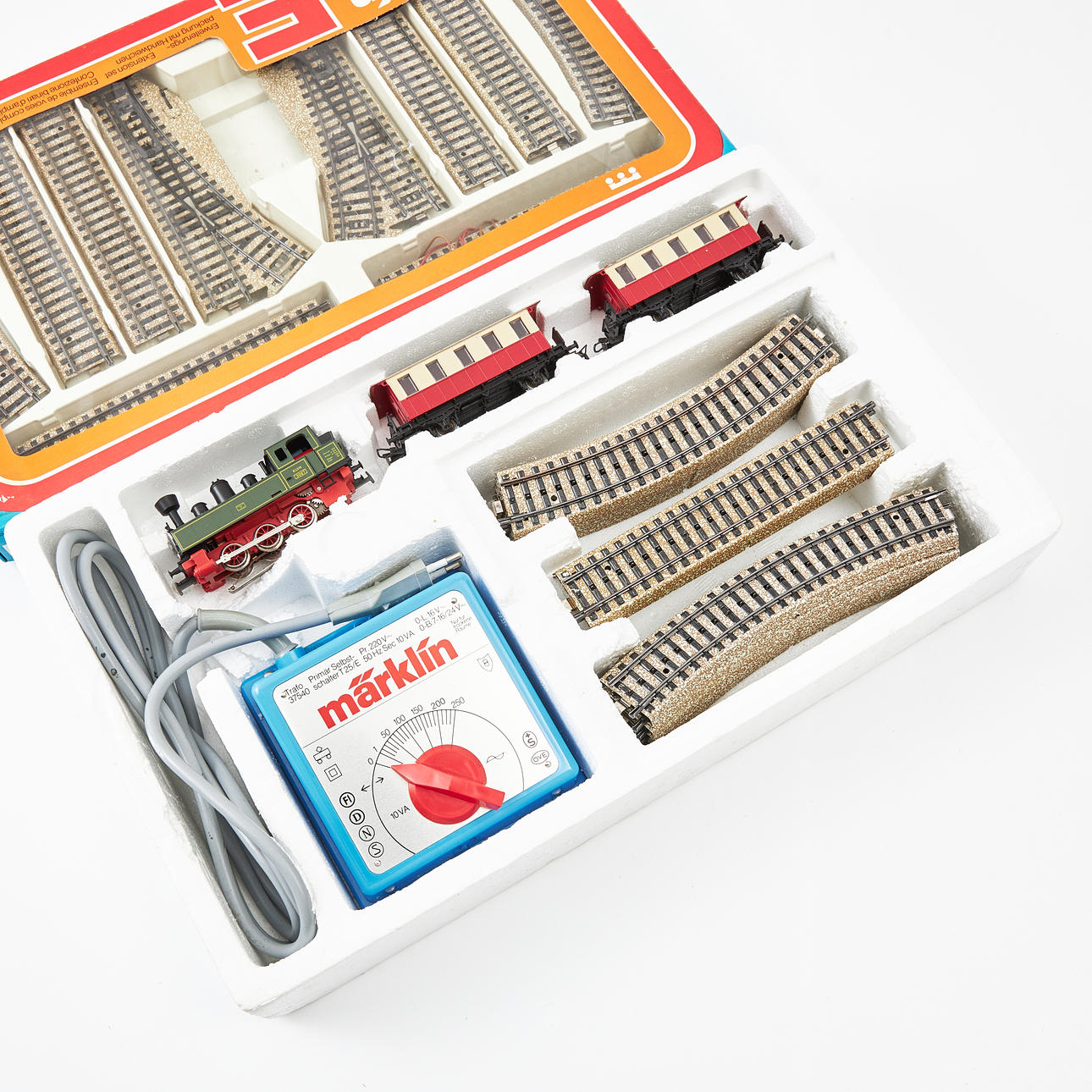Basic set 2905, basic set 2900, track set 5190 and 2 loose locomotives with 2 carriages. Largest box height 10, 60x40 cm.