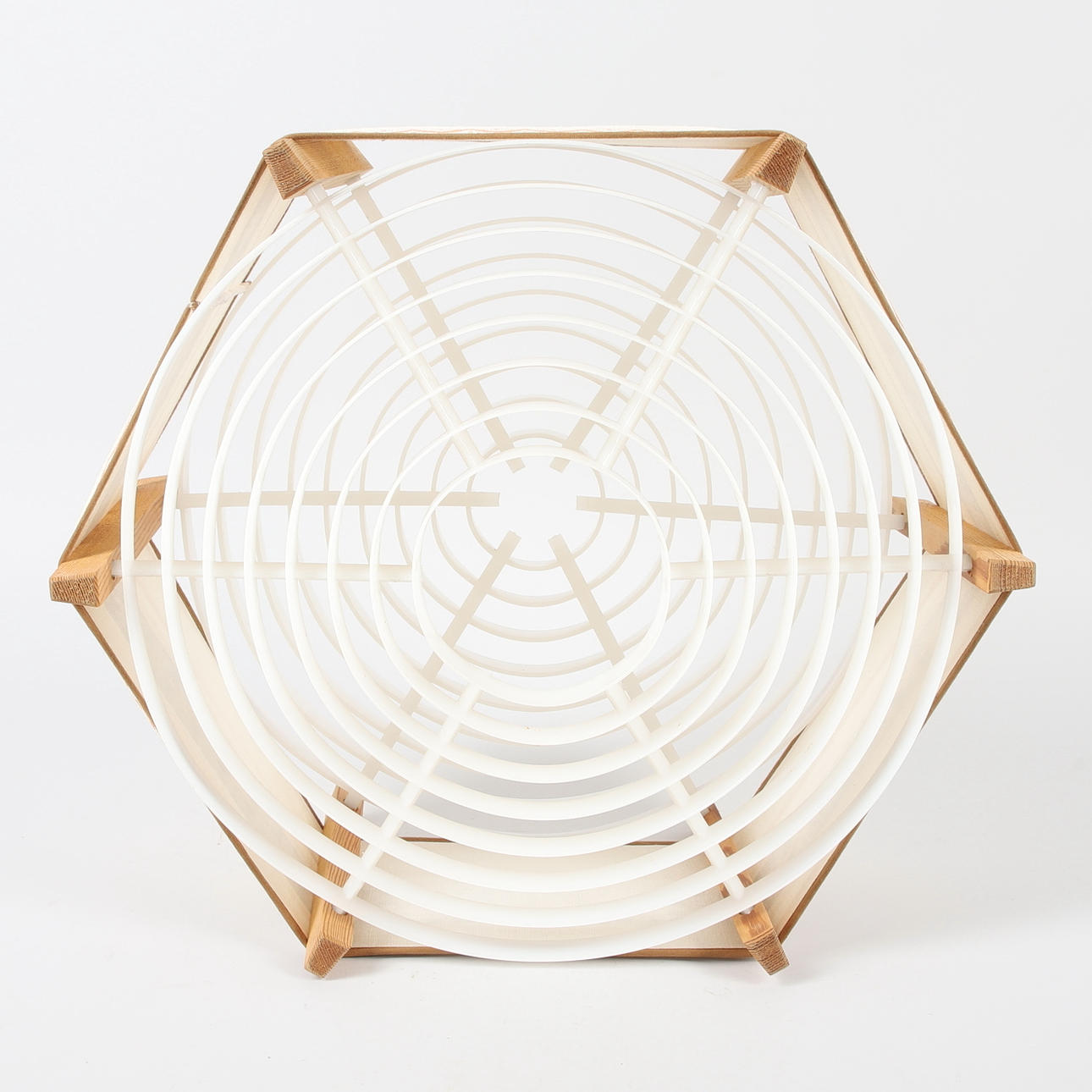 A lamp shade, pine, textile and plastic, 1960/70s.
