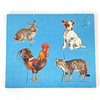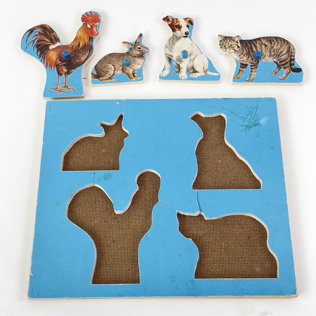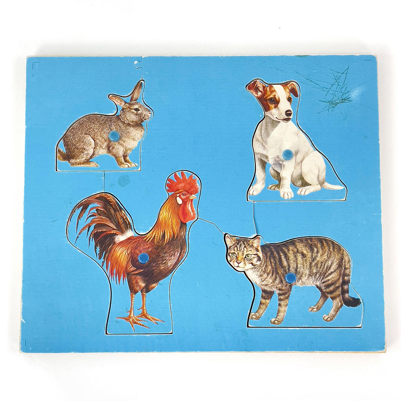 1 wooden puzzle with 4 pieces, animal pictures, dimensions approx. 25 x 21 cm.