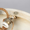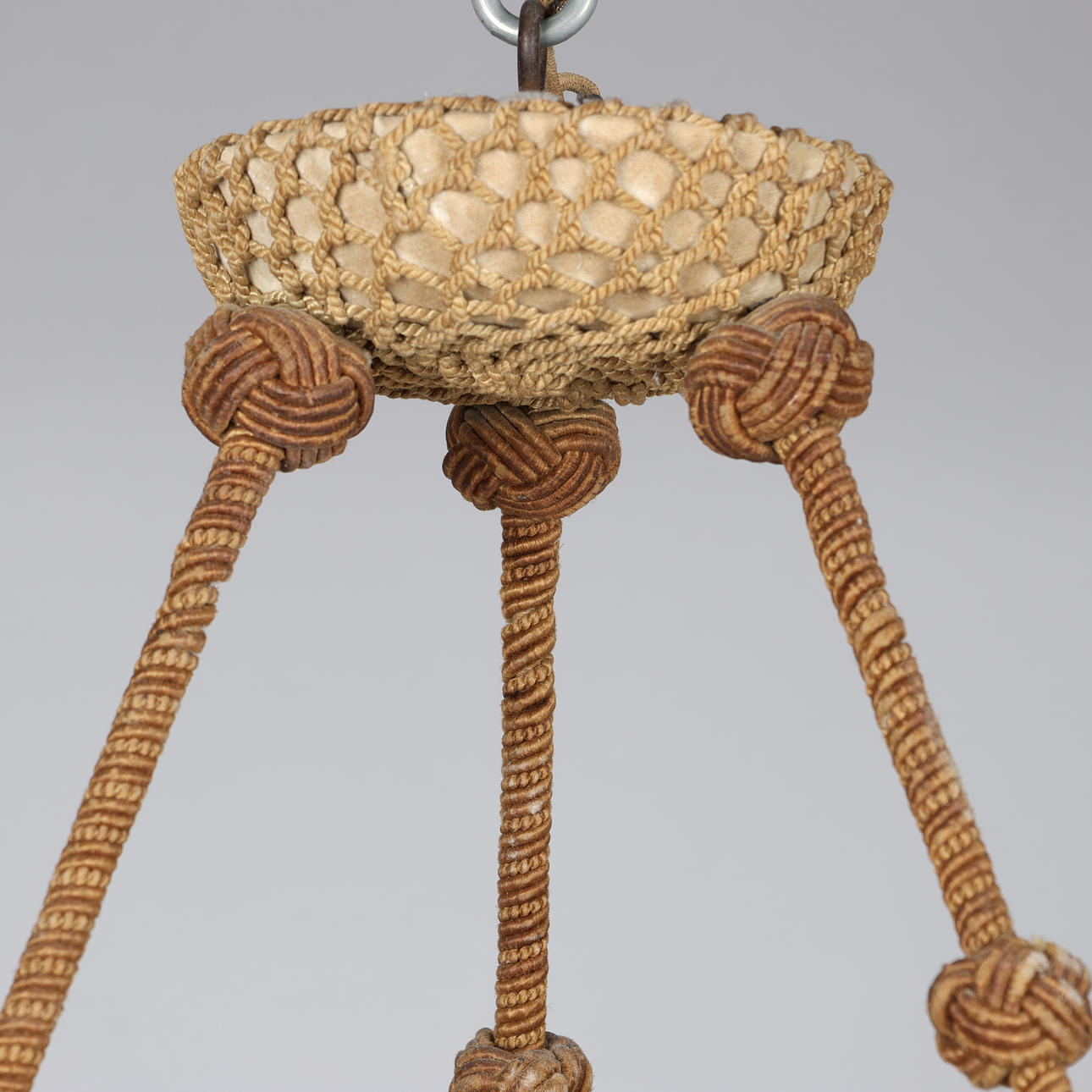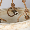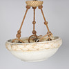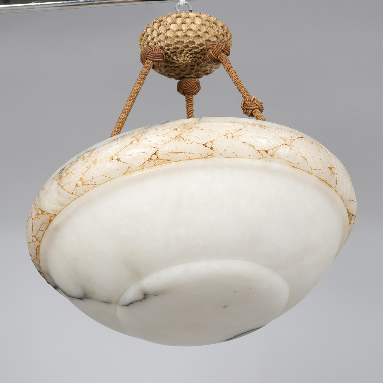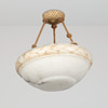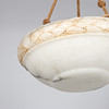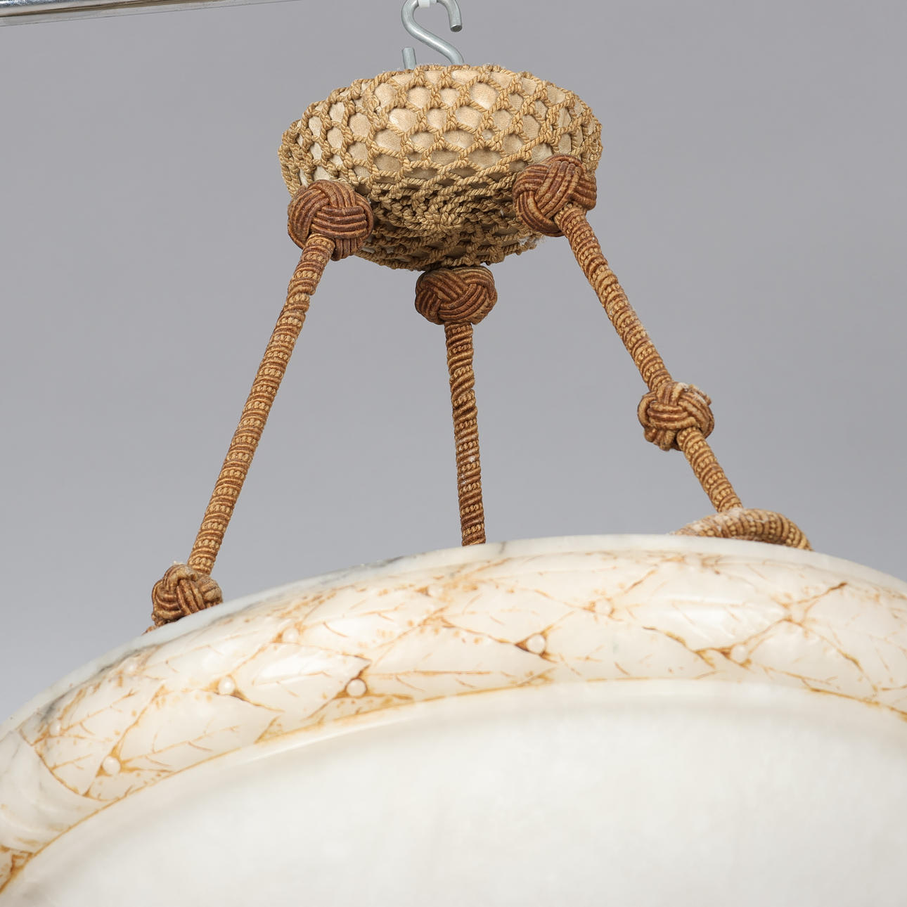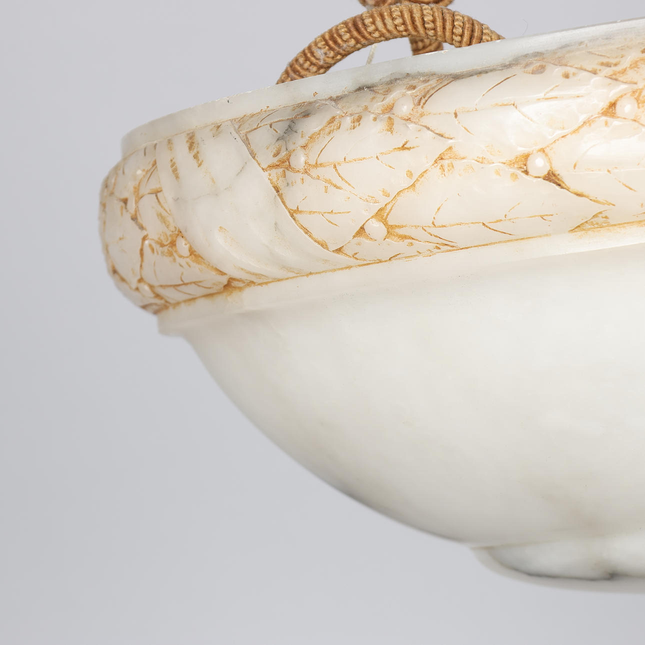 Large ceiling lamp (plafond) of alabaster with relief, suspension and details in brass, three light sources.